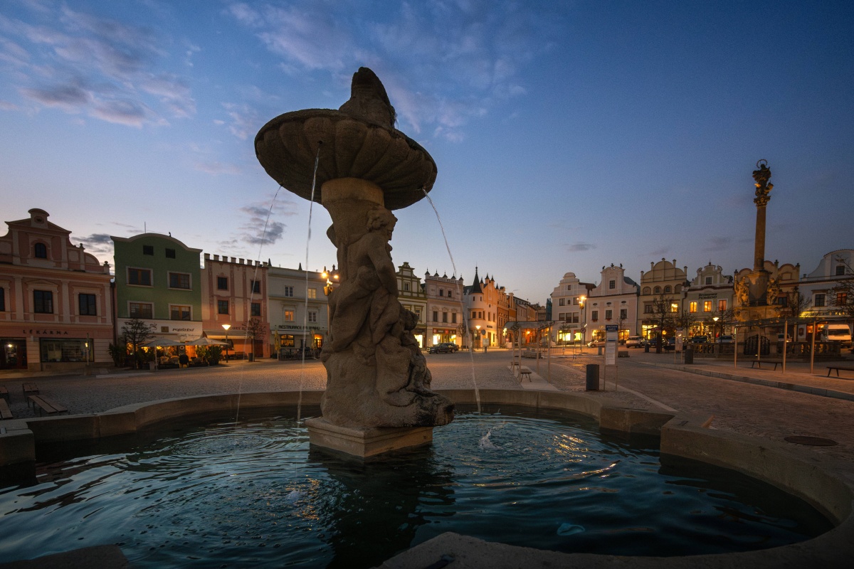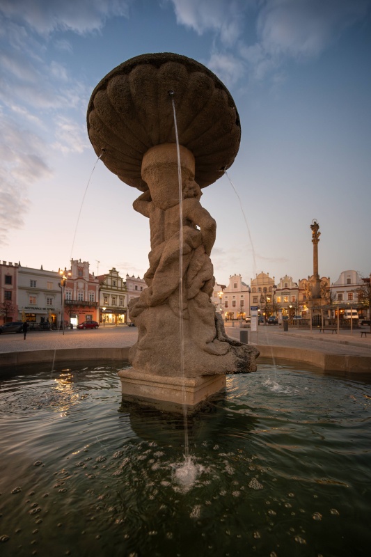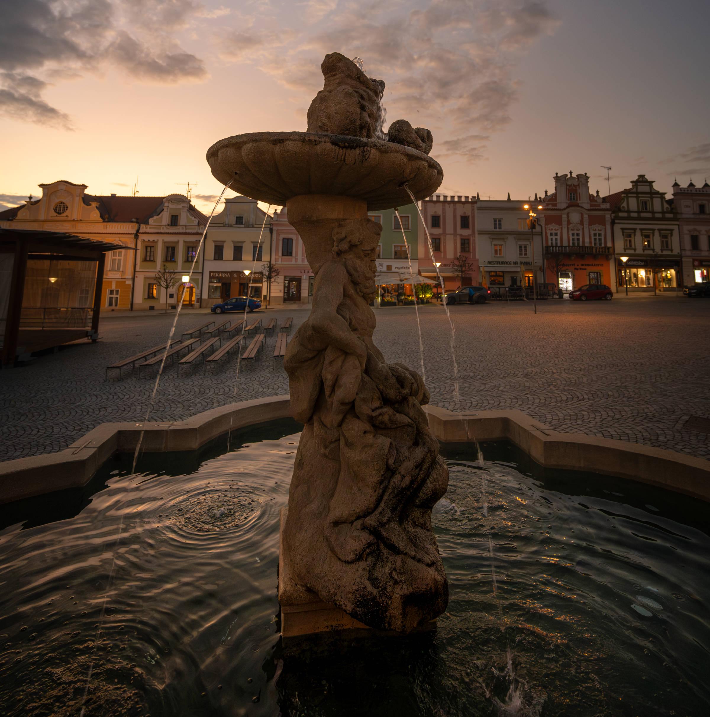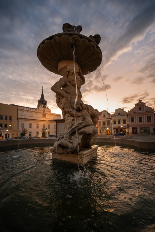 Ozdobou náměstí je i kamenná barokní pískovcová kašna, uprostřed se sochou antického boha Tritona s jeho atributy, delfínem a mušlí. Před ní plnila tuto funkci patrně pozdně gotická kašna do níž asi ústil středověký městský vodovod, jeden z prvních v Čechách. Význačné technické dílo povolili zřídit rychtáři Michalovi majitelé města, pánové z Lipé, listinou z 26. 6. 1362. Dokonalý vodovod postavil znalec vodních důlních děl z těžby stříbra.
