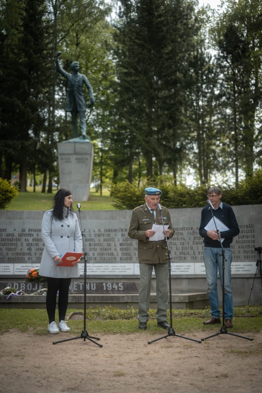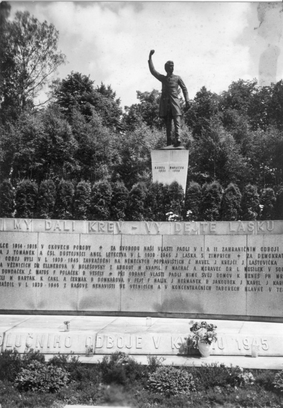 Nachází se v těsné blízkosti pomníku K. H. Borovského. Po šesti letech německé okupace se město dočkalo osvobození. Radost ze svobody se však mísila se smutkem, protože poslední dny 2. světové války v Německém Brodě byly tragické. Dne 5. 5. 1945, po zprávách o Pražském povstání, oznámil nově ustanovený revoluční národní výbor obnovení Československé republiky, převzetí správy nad městem a jeho přejmenování na Havlíčkův Brod. Po počátečním vyjednávání s německými okupanty obklíčily jednotky SS radnici a ve městě bylo vyhlášeno stanné právo. Začaly represálie proti ozbrojeným vlastencům, které trvaly až do 8. 5., kdy Němci začali ustupovat. Město bylo osvobozeno příchodem vojsk 2. ukrajinského frontu maršála Malinovského dne 9. 5. Oslavu vítězství však zkalilo objevení hromadných hrobů umučených rukojmích v Lázničkově stráni a v Hurtově Lhotě u Věže. Po exhumaci byly tělesné ostatky umučených pietně pohřbeny 14. 5. 1945 za účasti celého města v městských sadech, v místech plánovaného památníku, věnovaného obětem války. Zásluhu na stavbě pomníku měl A. Šouba, předseda městského národního výboru. Vzhledem k poválečné situaci byl památník slavnostně odhalen až 11. 5. 1947, o rok později než pomník Havlíčkův. Oblouk z leštěné žuly se jmény brodských občanů, kteří zahynuli ve dvou světových válkách, navrhl architekt František Marek. Jejich seznam zmizel v roce 1975, protože někteří nevyhovovali komunistické ideologii, a nahradily jej bronzové reliéfy (1977). Jména padlých se vrátila na pomník až ve změněné politické situaci a byla doplněna jmény židovských spoluobčanů, kteří se nevrátili z koncentračních táborů.