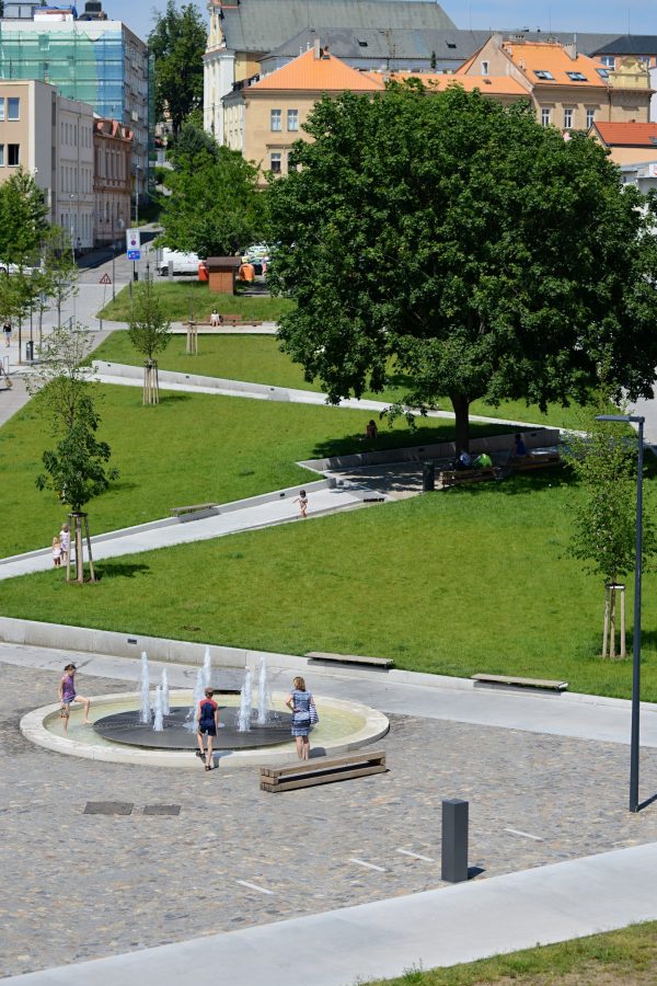Býval zde koňský trh a středověká zástavba se špalíčkem budov. Za socialismu byla celá čtvrť v rámci asanace centra zbourána. Nahradila ji rozlehlá obdélníková volná plocha, kterou ze západní strany lemují obchody. Pod náměstím je velké množství spodní vody. V minulosti tu totiž bývaly dvě studny, které zásobují nové vodní prvky náměstí.