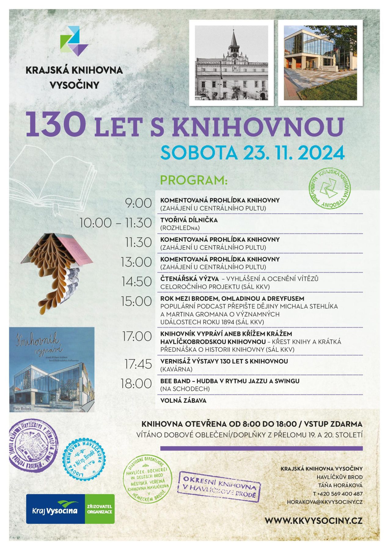 Srdečně vás zveme na oslavy tohoto významného jubilea, které se konají v sobotu 23. listopadu 2024. Rádi vás přivítáme v dobovém oblečení/doplňcích z přelomu 19. a 20. století. Knihovna bude otevřena od 8:00 do 18:00, po celý den na všechny akce vstup zdarma.