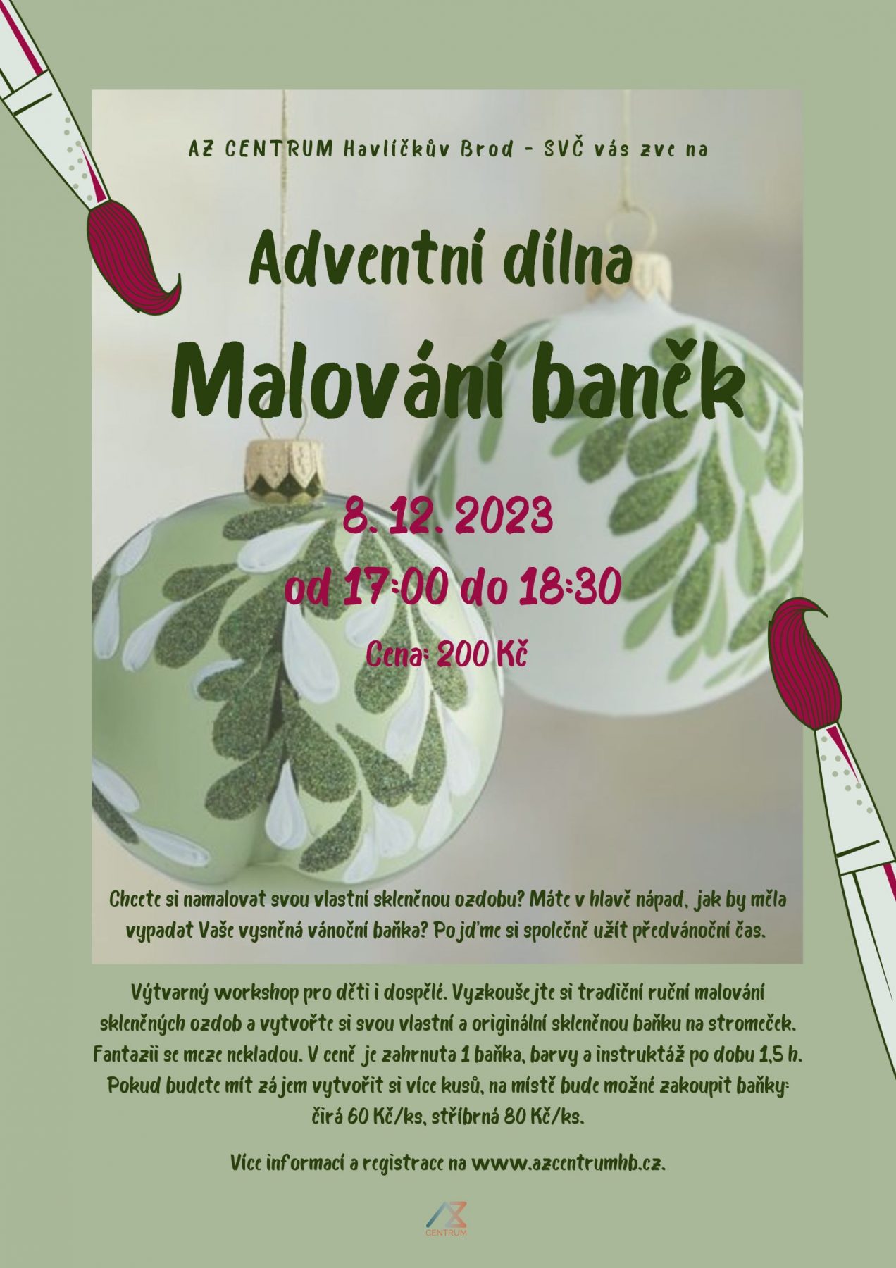 Chcete si namalovat svou vlastní skleněnou ozdobu? Máte v hlavě nápad, jak by měla vypadat Vaše vysněná vánoční baňka? Pojďme si společně užít předvánoční čas. Výtvarný workshop pro děti i dospělé.