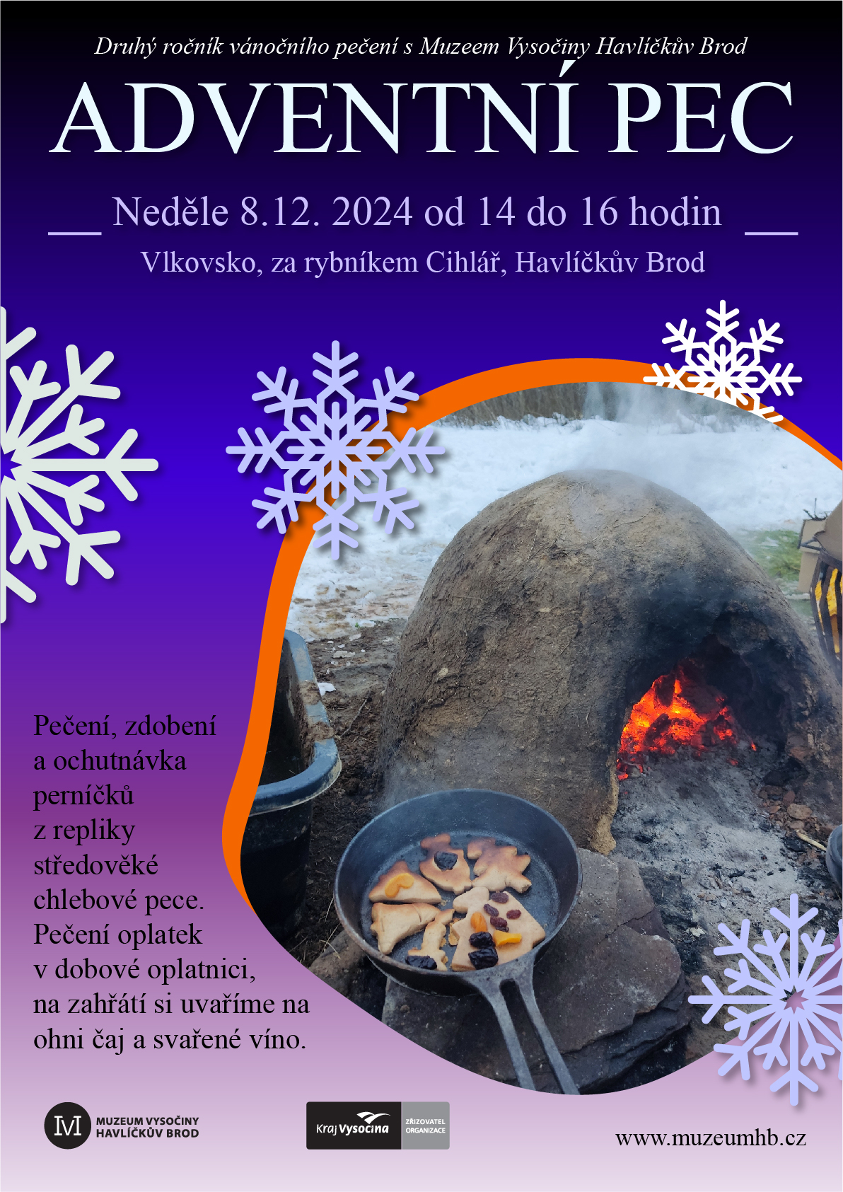 Muzeum Vysočiny Havlíčkův Brod vás srdečně zve na druhou adventní neděli 8. prosince na vánoční pečení v chlebové peci ve Vlkovsku. Kromě perníčků vyzkoušíme i pečení oplatek v tradiční železné oplatnici. Přijďte prožít adventní neděli v klidu přírody u roztopené pece.