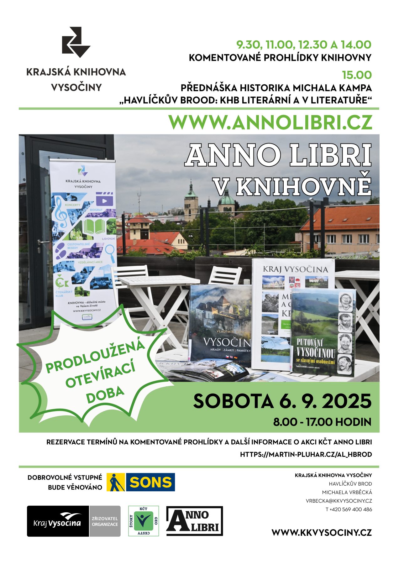 Sobota 6. 9. bude patřit turistům a knihám. Krajská knihovna Vysočiny se stane součástí seriálu akcí Klubu českých turistů ANNO LIBRI. Přijďte spojit turistiku s kulturou a podívat se, jak knihovna dýchá v sobotu. Těšíme se na Vás – ať už přijdete s batohem, nebo jen tak!
