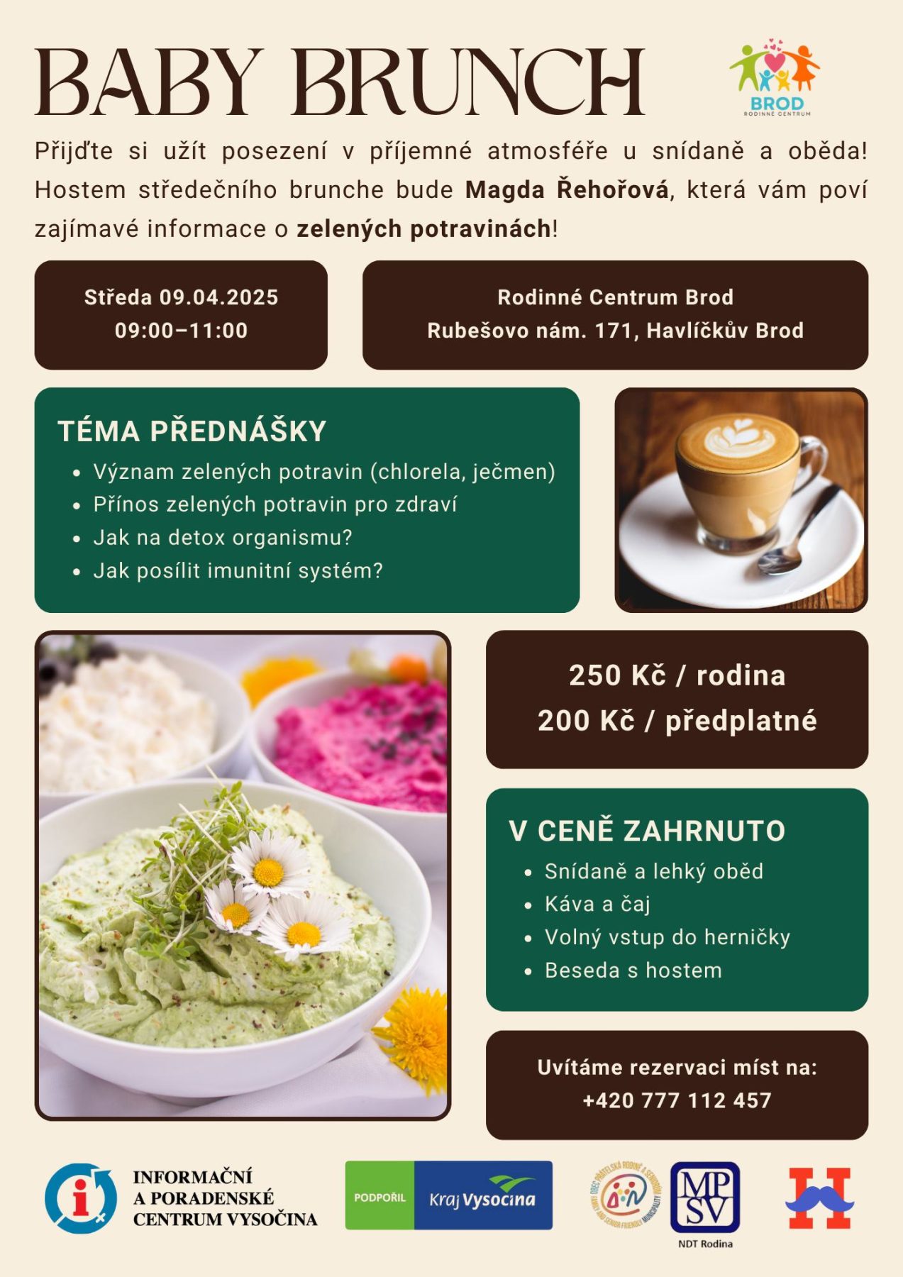 Přijďte si užít posezení v příjemné atmosféře u snídaně a oběda. Hostem středečního brunche bude Magda Řehořová, která vám poví zajímavé informace o zelených potravinách.
