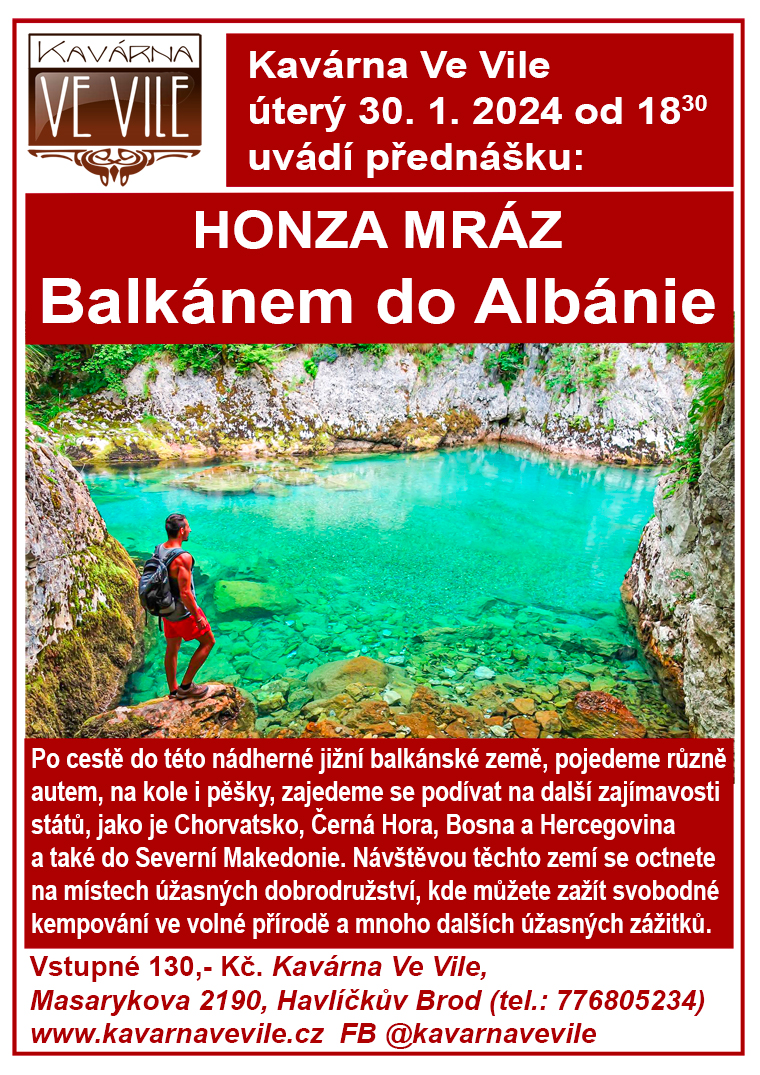 Přijďte posedět a zaposlouchat se do vyprávění o Albánii. Po cestě do této nádherné jižní balkánské země, kterou tak opět různě prokličkujeme autem, na kole i pěšky, se zajedeme podívat na další zajímavosti okolních států, jako je Chorvatsko, Černá Hora, Bosna a Hercegovina a také do Severní Makedonie. Návštěvou těchto zemí se octnete na místech úžasných dobrodružství, kde můžete zažít svobodné kempování ve volné přírodě a mnoho dalších neskutečných zážitků. Fotografie, vyprávění a videa.