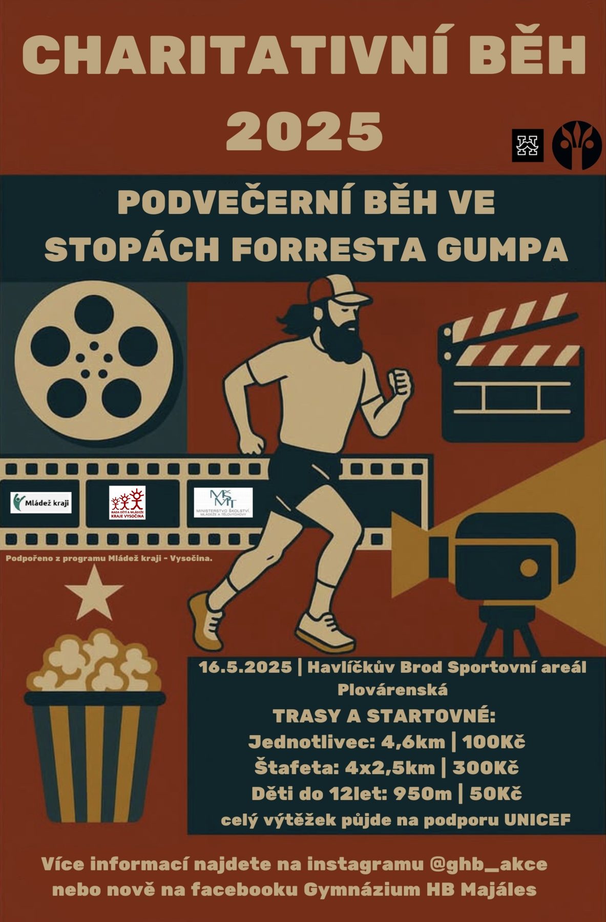 Běh pro UNICEF 16. 5. 2025 (ve stopách Foresta Gumpa) registrace od 17:15 samotný start v 18:20 předpokládané ukončení v 19:55.
