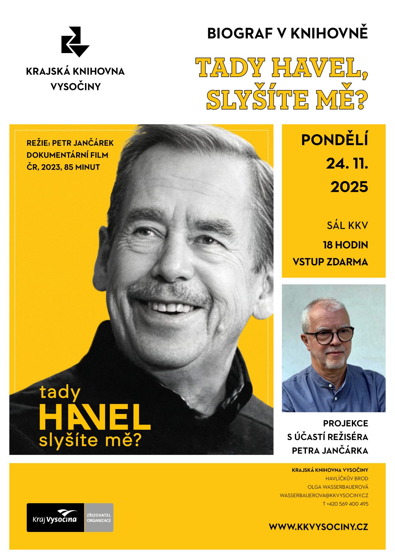 Prezident, občan, režisér, přítel, manžel, pacient, muž na sklonku života. Unikátní dokument představuje Václava Havla v jeho známých, ale i veřejnosti dosud skrytých polohách. Vychází přitom z nikdy nepublikovaného materiálu, natočeného během posledních let jeho života. Po skončení promítání bude následovat diskuze s režisérem filmu Petrem Jančárkem.