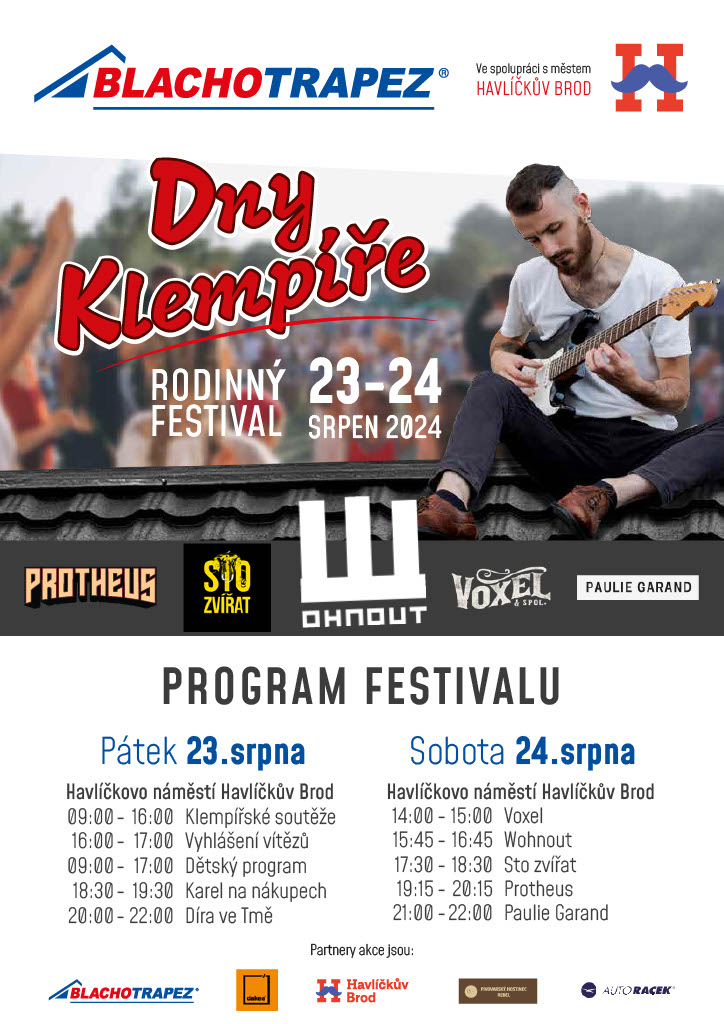 Utkání nejlepších klempířů z Čech i Slovenska. 12 soutěžních dvojic se utká v páteční soutěži o titul Blachotrapez Klempíř roku a spoustu hodnotných cen. Po celou dobu pátečního programu bude pro širokou veřejnost připraven doprovodný program, který obsahuje skákací hrady, malování na tvář, cukrovou vatu a mnoho dalšího. Na závěr náročného dne rozezní náměstí lokální kapely KAREL NA NÁKUPECH a DÍRA VE TMĚ.