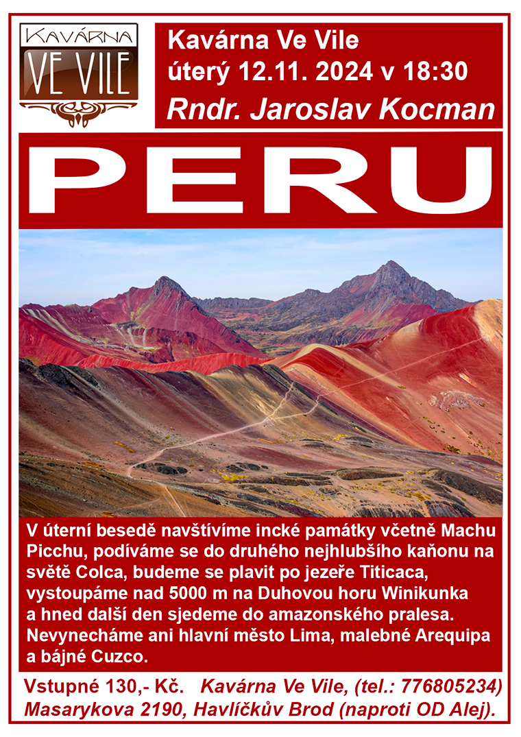 V úterní besedě navštívíme incké památky včetně Machu Picchu, podíváme se do druhého nejhlubšího kaňonu na světě Colca, budeme se plavit po jezeře Titicaca, vystoupáme nad 5000 m na Duhovou horu Winikunka a hned další den sjedeme do amazonského pralesa. Nevynecháme ani hlavní město Lima, malebné Arequipa a bájné Cuzco.