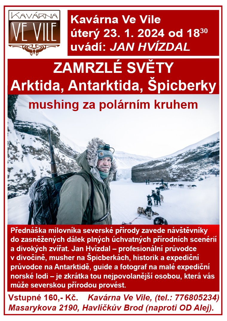 Přednáška milovníka severské přírody zavede návštěvníky do zasněžených dálek plných úchvatných přírodních scenérií a divokých zvířat. Jan Hvízdal – profesionální průvodce v divočině, musher na Špicberkách, historik a expediční průvodce na Antarktidě, guide a fotograf na malé expediční norské lodi – je zkrátka tou nejpovolanější osobou, která vás může severskou přírodou provést.