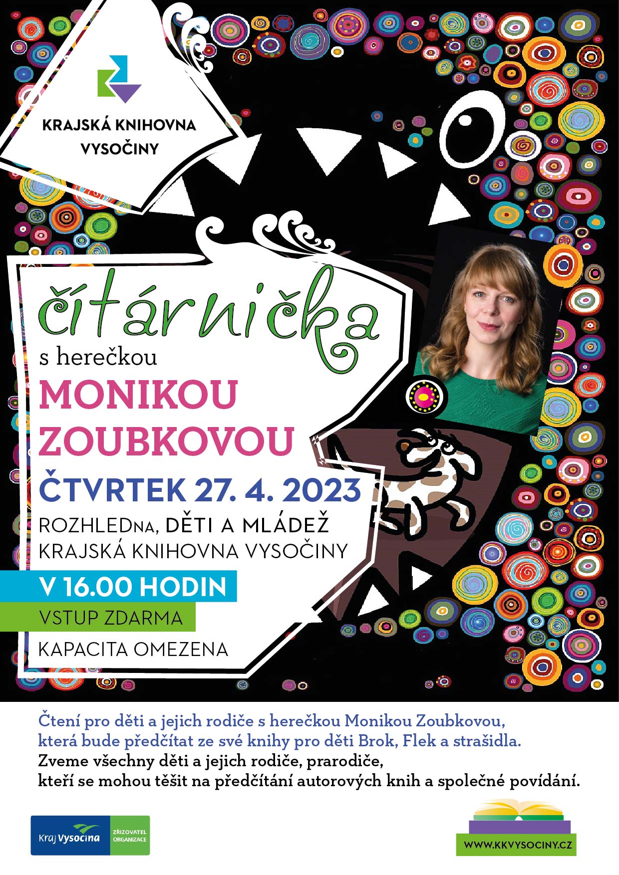 Čtení pro děti a jejich rodiče s herečkou Monikou Zoubkovou, která bude předčítat ze své knihy pro děti Brok, Flek a strašidla.