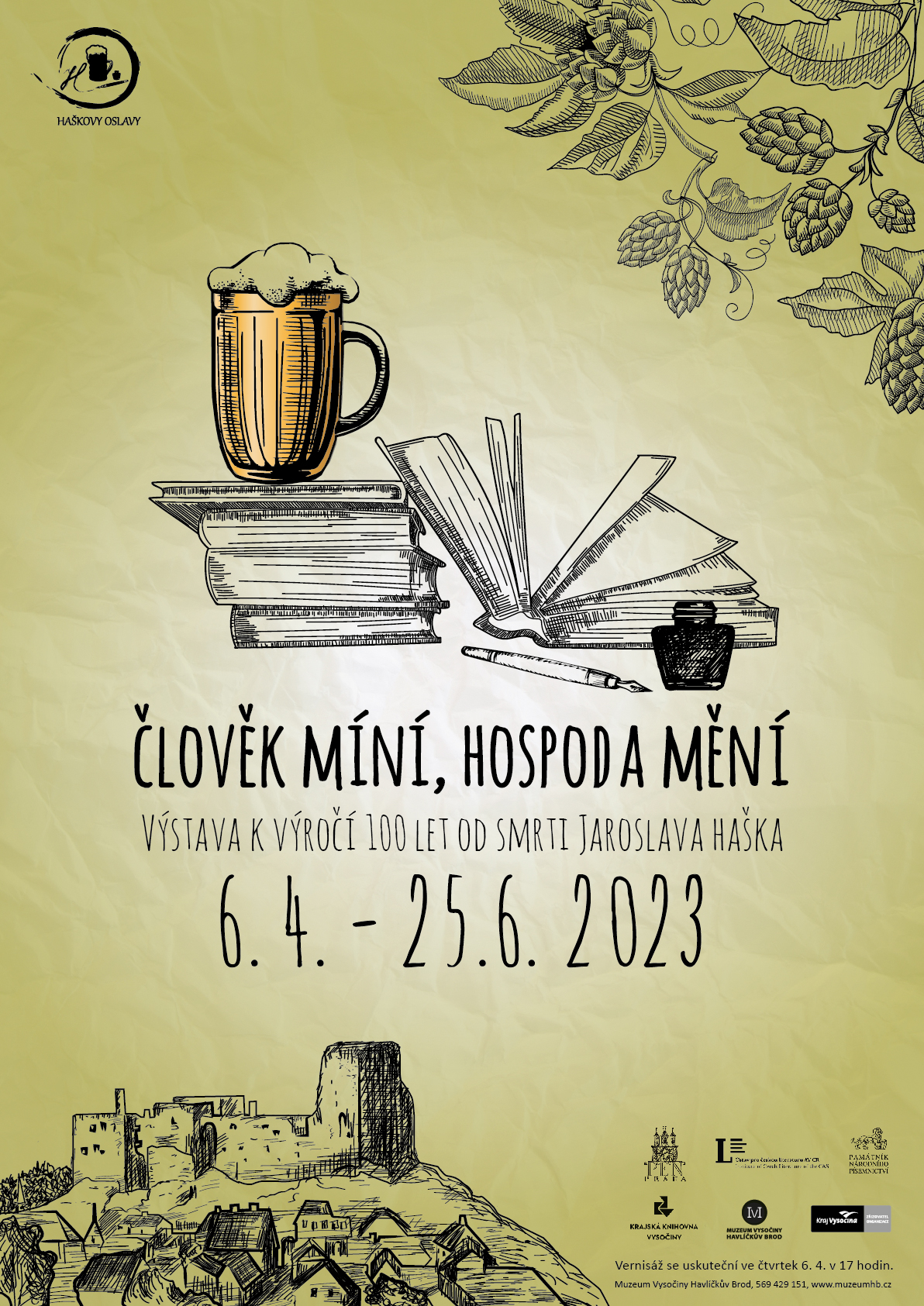 Jaroslav Hašek slaví v tomto roce dvě významná životní výročí – 140 let od narození a 100 let od úmrtí. Muzeum Vysočiny Havlíčkův Brod připomene výstavou Člověk míní, hospoda mění ve dnech 6. dubna až 25. června tohoto slavného spisovatele, který neodmyslitelně patří do našeho regionu. Vernisáž se uskuteční v Muzeu Vysočiny Havlíčkův Brod dne 6. dubna v 17 hodin, její součástí bude i hraná adaptace Haškovy kabaretní hry Hora olivetská aneb Výprava Čechů v Jeruzalémě za účasti muzejníků. Výstava bude probíhat v rámci Haškových oslav, na kterých se podílí řada dalších institucí.
