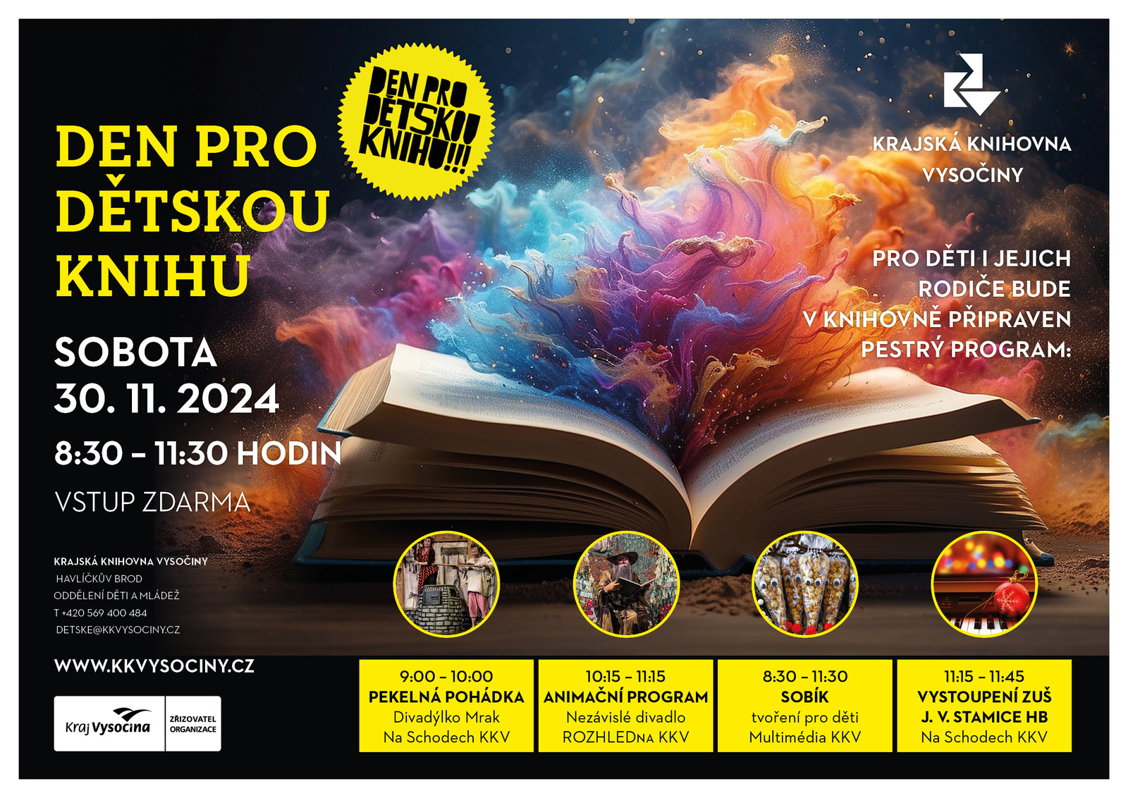 V letošním roce nás čeká další ročník akce na propagaci dětských knih a dětského čtenářství - Den pro dětskou knihu. Celorepublikovou akci pořádá Krajská knihovna Vysočiny v Havlíčkově Brodě v sobotu 30. listopadu 2024 od 8:30 do 11:30 hodin, vstup zdarma.