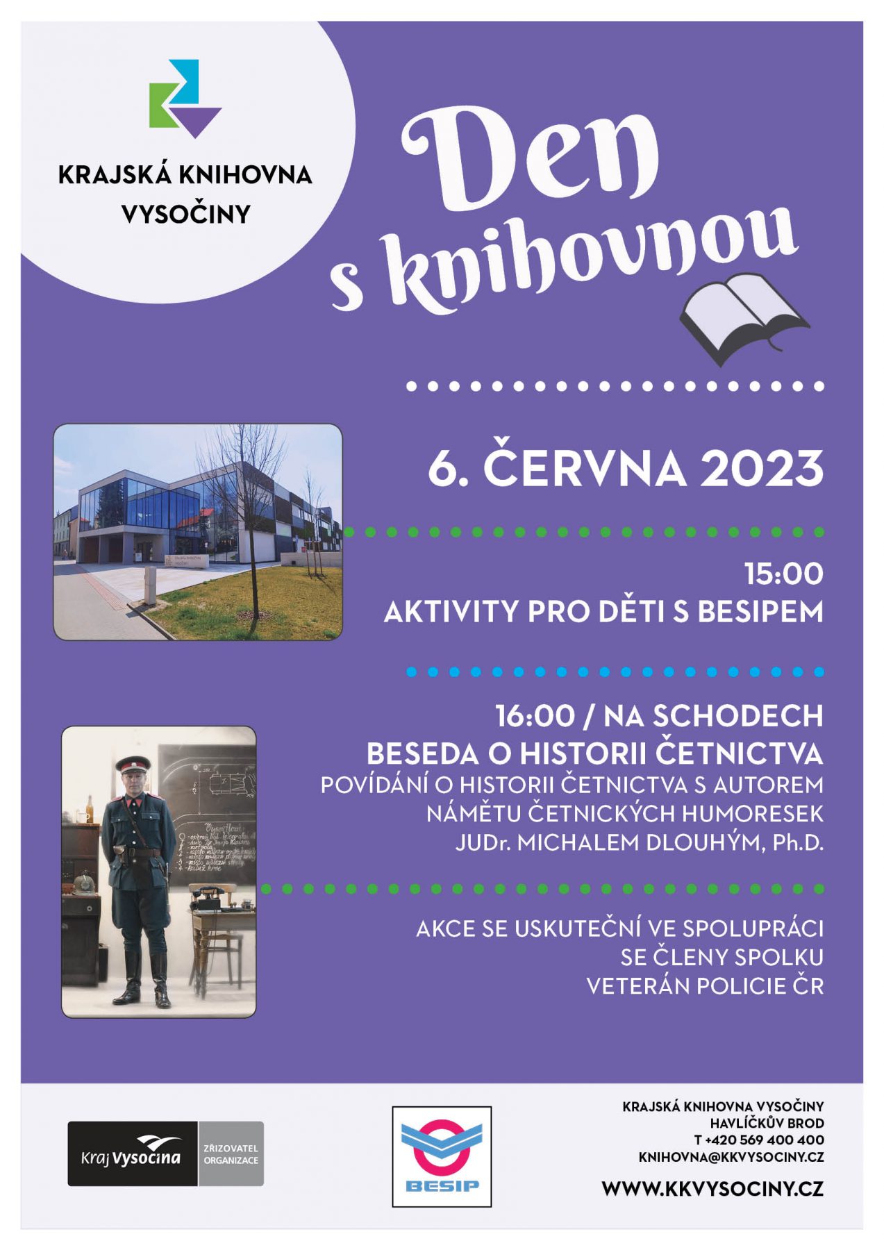 Krajská knihovna Vysočiny pořádá ve spolupráci s BESIPem a spolkem Veterán Policie ČR v úterý 6. června od 15:00 Den s knihovnou. Přijďte si užít odpoledne plné her, soutěží, úkolů, přednášku o historii četnictva s JUDr. Michalem Dlouhým, Ph.D.