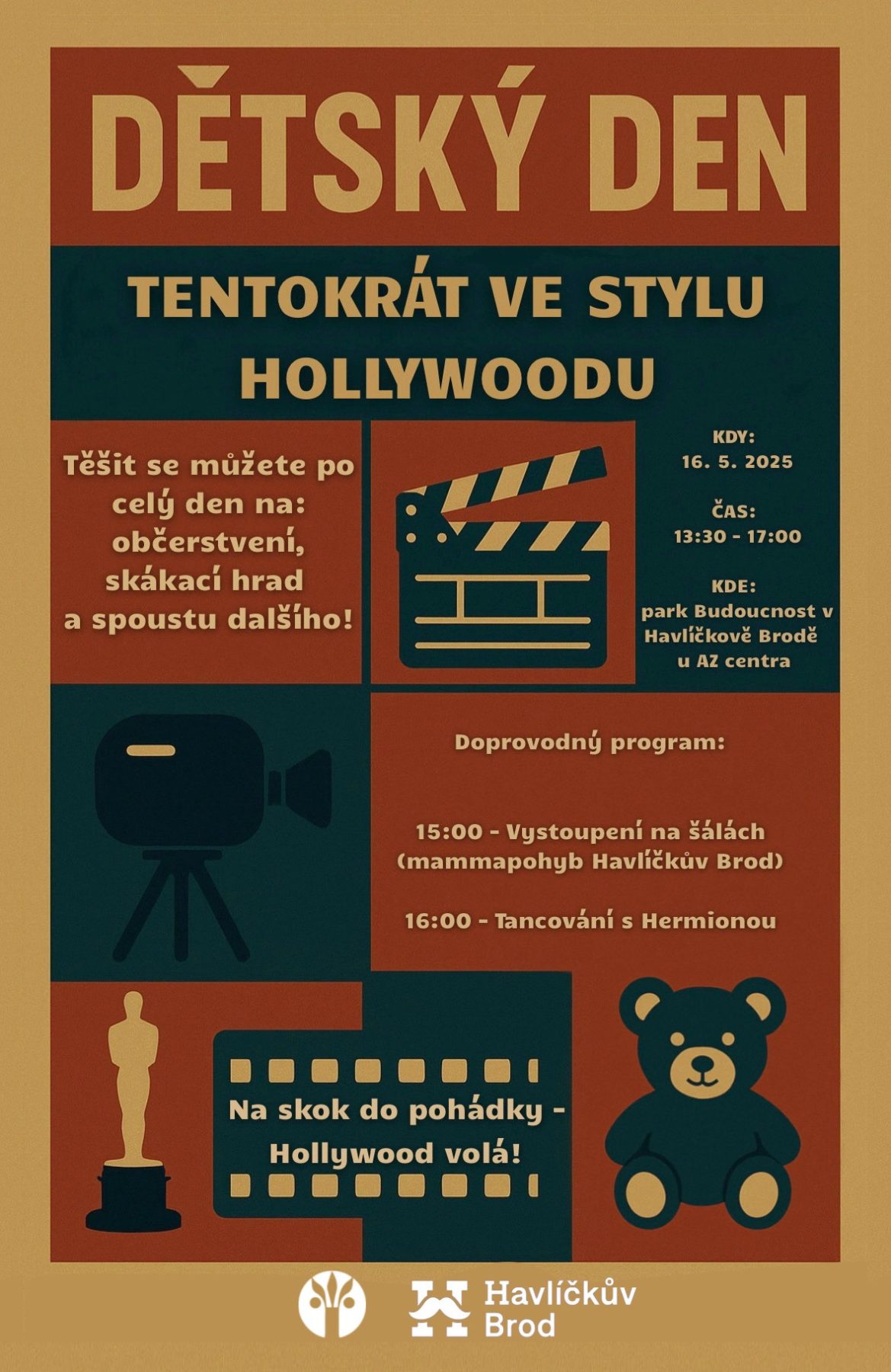 Dětský den (Na skok do pohádky aneb Hollywood) bude v parku Budoucnost dne 16. 5. 2025 od 13:30 do 17:00.