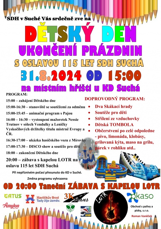 Přijďte oslavit ukončení letních prázdnin a zároveň 115 let SDH Suchá.