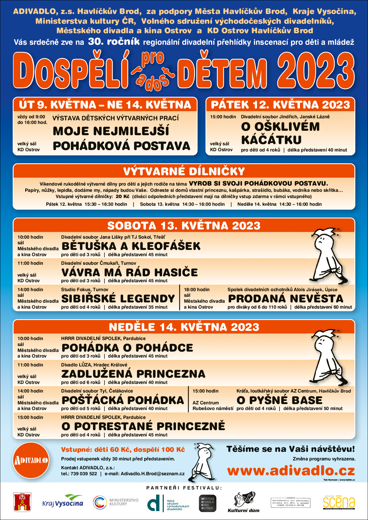 Jubilejní třicátý ročník odstartuje v pátek 12. května odpoledne přehlídka divadla pro děti a mládež Dospělí (pro radost) dětem. Tři víkendové dny nabídnou malým i velkým divákům desítku divadelních představení od devíti divadelních souborů nejen z Vysočiny, ale také z Pardubic, Hradce Králové, Turnova nebo Čelákovic.