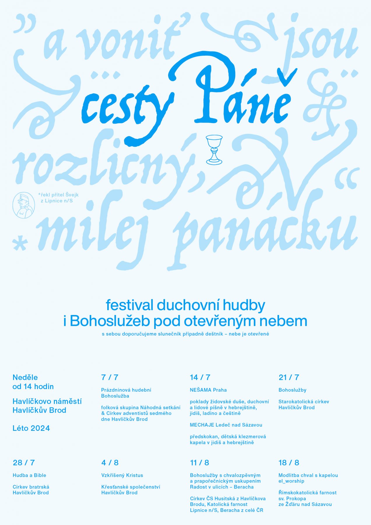 11.8.2024;  14:00 - Bohoslužby s chvalozpěvným a prapořečnickým uskupením Radost v ulicích – Beracha, Církev ČS Husitská z Havlíčkova Brodu, Katolická farnost Lipnice n/S, Beracha z celé ČR