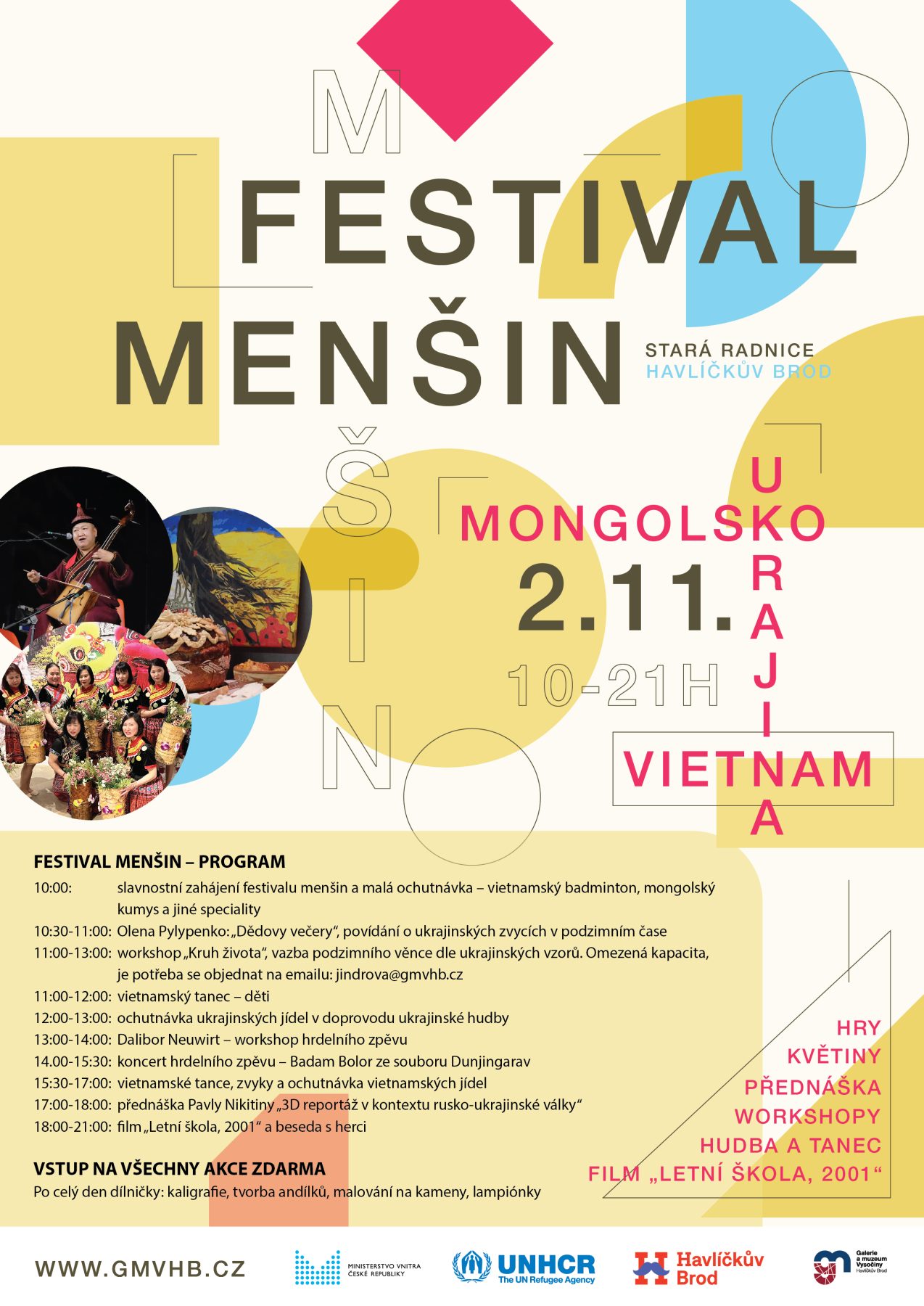Ukrajinské, mongolské a vietnamské odpoledne letos nahradí Festival menšin, který představí nejpočetnější menšiny žijící v České republice i v našem městě. Festival se uskuteční 2. listopadu od 10:00 do 21:00 v prostorách Staré radnice na Havlíčkově náměstí.
