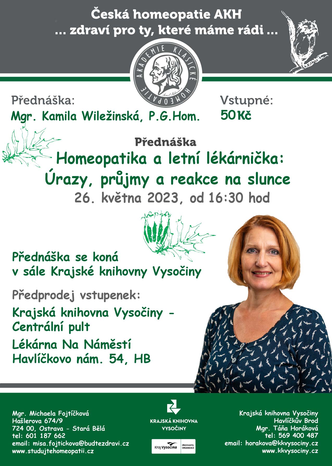 Srdečně Vás zveme na přednášku Homeopatika a letní lékárnička: úrazy, průjmy a reakce na slunce Mgr. Kamily Wiležinské, P. G. Hom.