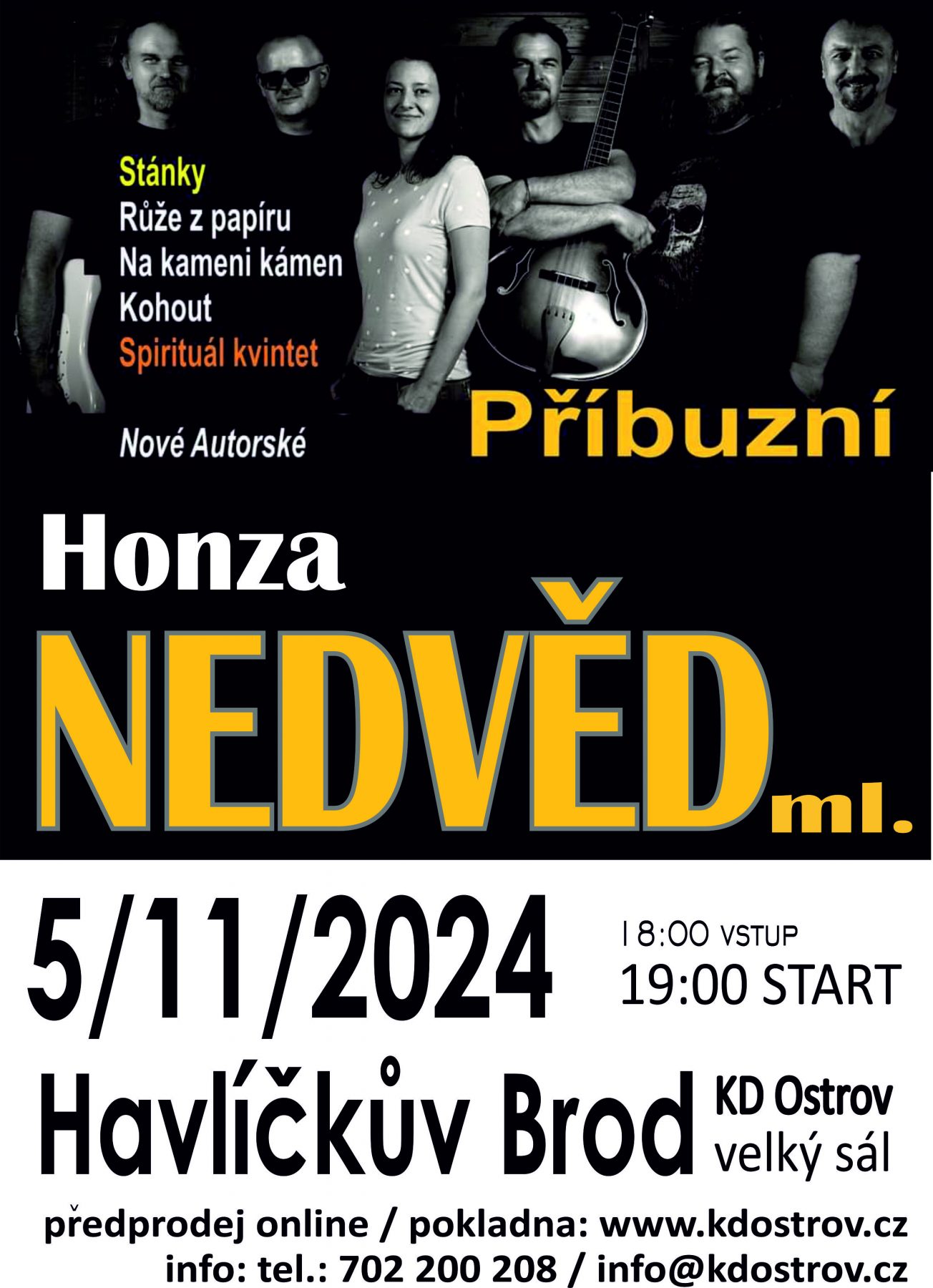 Nejhezčí Nedvědovky s Honzou Nedvědem ml. Honza Nedvěd mladší, Hanka Nedvědová a bratři Oršulíci spolu šlápli do pedálů a opět hraje hudební skupina Příbuzní. Na koncertech si můžete zazpívat nejen staré hity Bratří Nedvědů, skupiny Spirituál Kvintet, Brontosaurů ale i Příbuzní. Uslyšíte i některé nové autorské písně, které Honza vydává na své nové desce a určitě alespoň jednu zahraje a zazpívá.