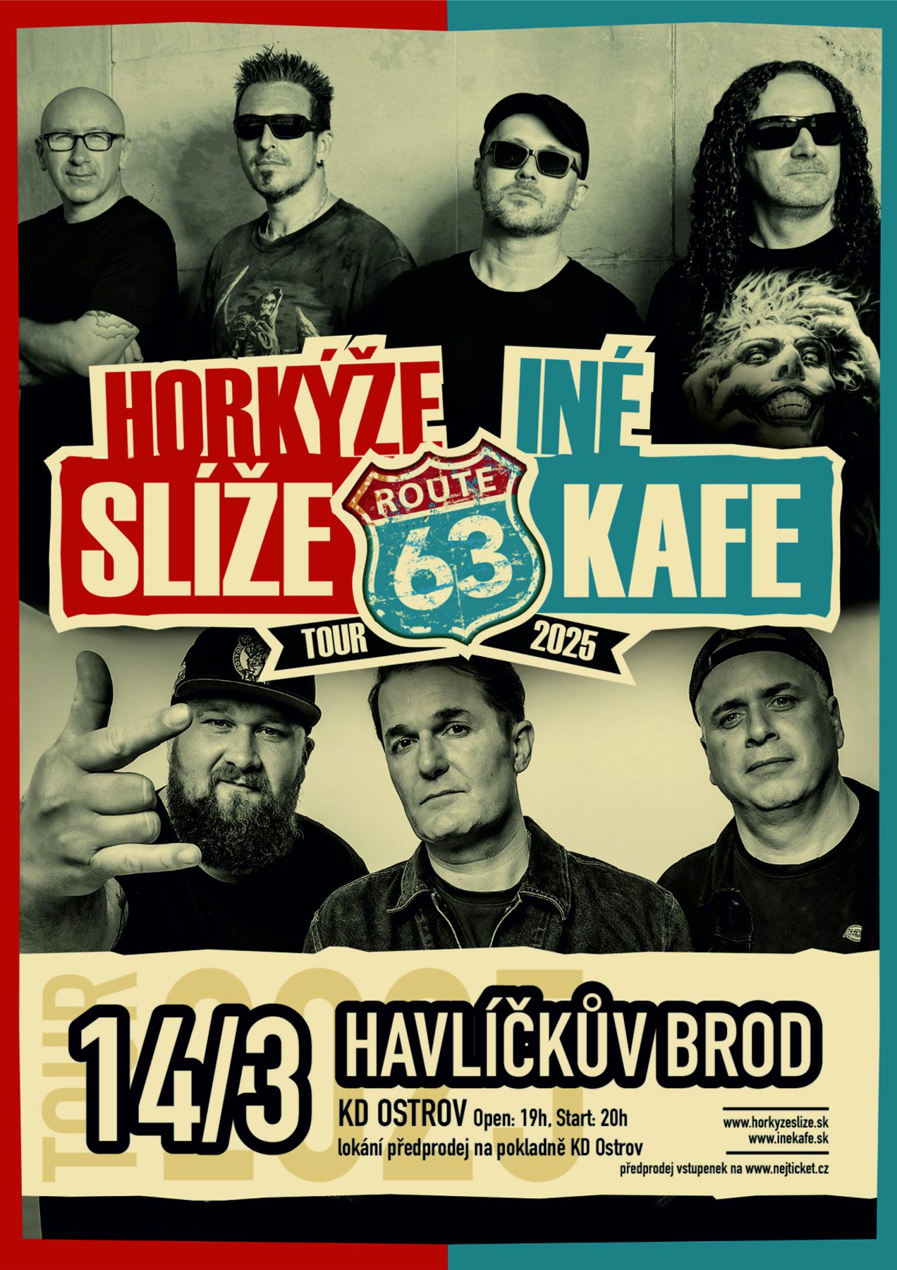V Praze 16. září 2024 - Dvě slovenské kapely, které mají dlouhá léta nesčetně příznivců i u nás, vyrazí na společné turné. A vzhledem k tomu, že se na hudební scéně pohybují v součtu již 63 let, zvolili si Horkýže Slíže a Iné Kafe pro svoji jarní bohatýrskou cestu za fanoušky Čech, Moravy a Slezska příznačný název Route 63. Mezi 14. březnem a 17. dubnem 2025 vyjedou na pomyslnou rockovou highway od Chebu až po Frýdlant nad Ostravicí. Zahrají také v Havlíčkově Brodě, Ústí nad Orlicí, Uherském Hradišti, Práčích u Znojma nebo v Kladně. Dále je uslyší příznivci slovenských legend v Českých Budějovicích, Boskovicích, Vsetíně nebo Benešově.