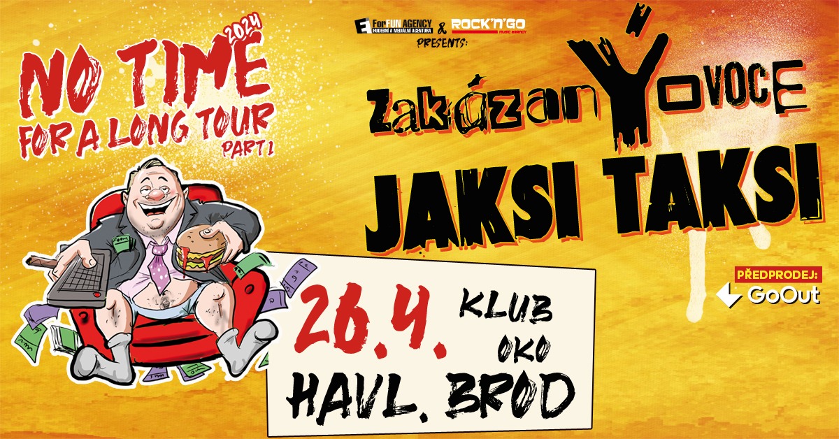 Jaro 2024 bude ve znamení punk-rockové jízdy kapel zakázanÝovoce, Jaksi Taksi. Tyto dvě stálice české punk-rockové scény rozezní ušní bubínky v sedmi městech, kam v rámci No time for a long tour 2024 na jaře dorazí. Fanoušci se mohou těšit na hity, ale i novinky, které kapely připravují.