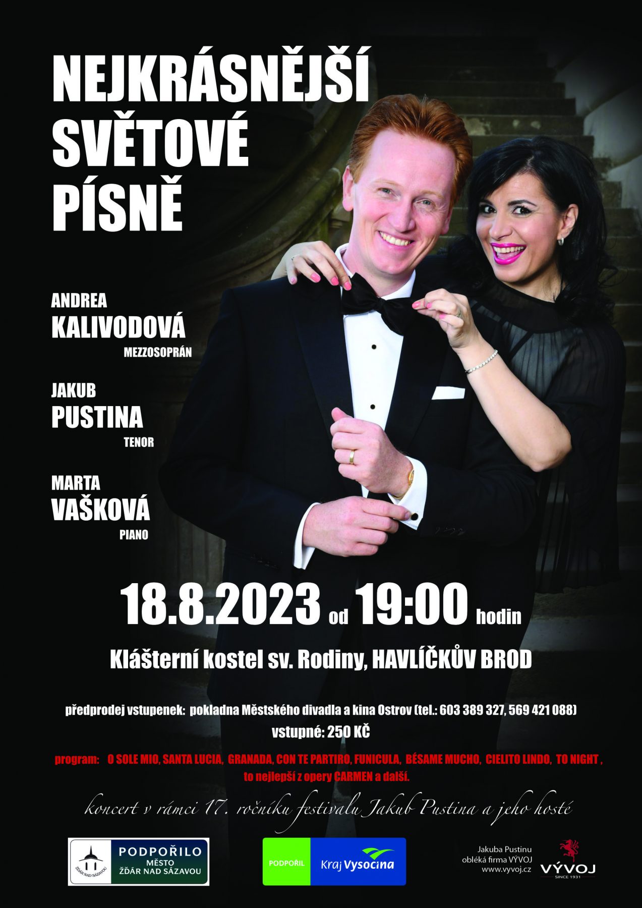 Koncert v rámci 17. ročníku festivalu „Jakub Pustina a jeho hosté“ s názvem "Nejkrásnější světové písně". V tomto programu vystoupí mezzosopranistka Andrea Kalivodová s tenoristou Jakubem Pustinou s velice poutavým a přitažlivým repertoárem. Program je složen z nejznámějších světových písní, jako je například: O sole mio, Granada, Santa Lucia, Funicula a mnohé další. Oba umělce na klavír doprovodí docentka Janáčkovy akademie múzických umění Marta Vašková.hostem bude Andrea KALIVODOVÁ