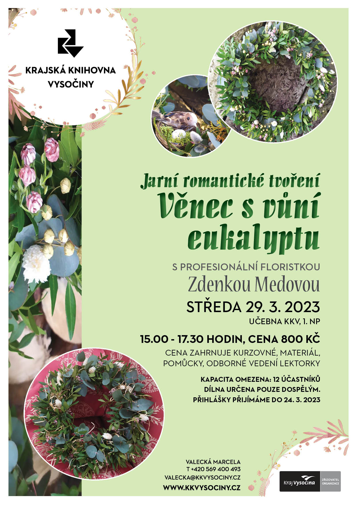 Krajská knihovna Vysočiny ve spolupráci s profesionální floristkou Zdenkou Medovou pořádají Jarní romantické tvoření – Věnec s vůní eukalyptu.