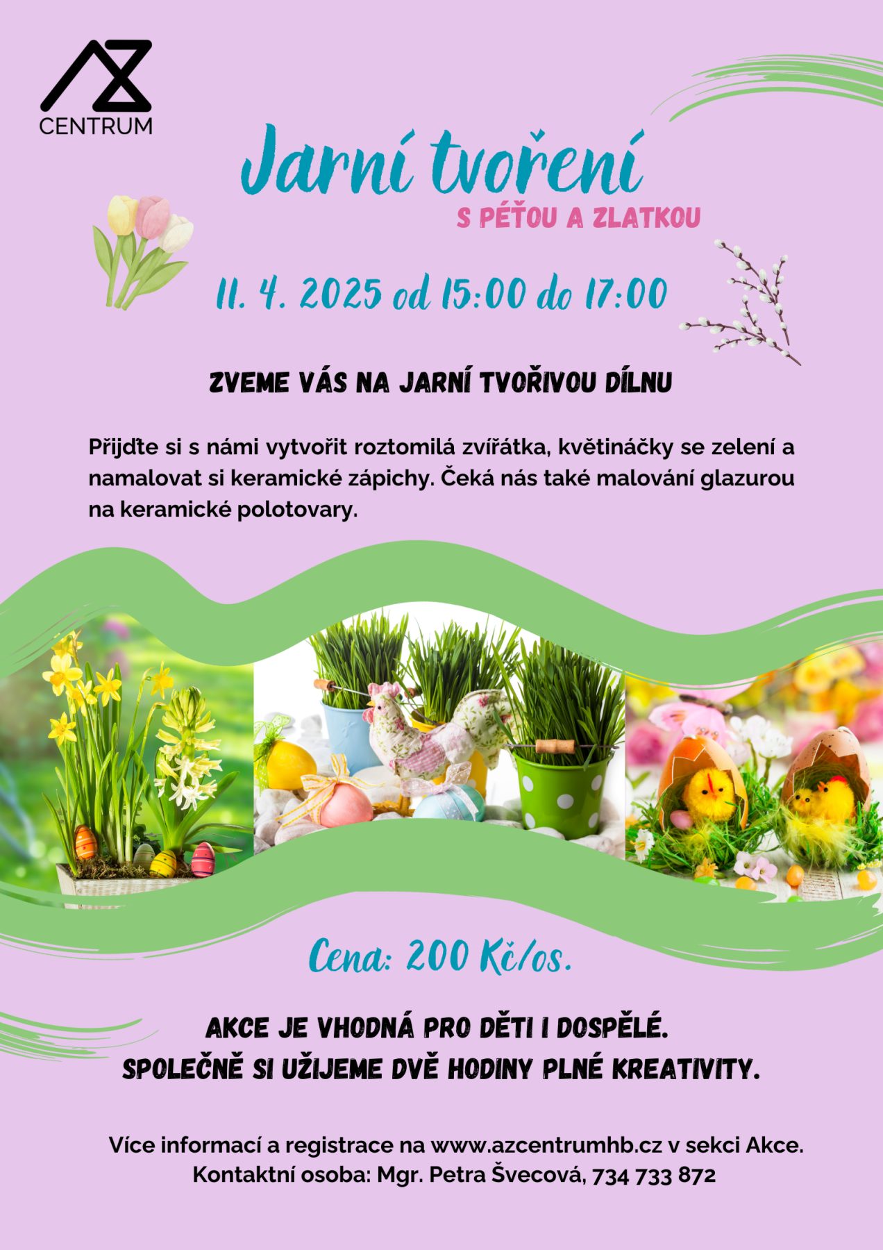 Zveme vás na tvořivou dílnu, kde si můžete vytvořit krásnou jarní výzdobu v podobě květináčků se zelení, roztomilých zvířátek nebo keramických zápichů.