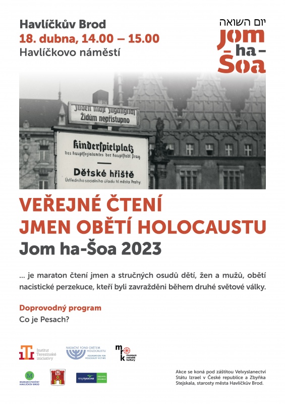 Zveme vás na připomínkovou akci Veřejné čtení jmen obětí holocaustu Jom ha-šoa, která se bude konat v Havlíčkově Brodě v úterý 18. dubna od 14.00 na Havlíčkově náměstí