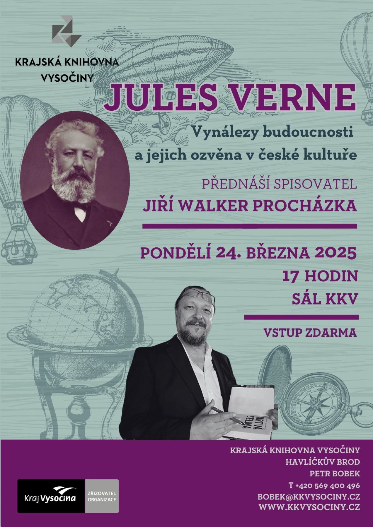 O životě a díle Julese Verna trochu jinak... Inspirace k jeho románům i vynálezům. Podivuhodné cesty (i na Měsíc). Francouzští ilustrátoři a geniální Karel Zeman. Čeští Verneové aneb Epigoni i ctitelé J. V. Připomínka 120 let od úmrtí Julese Verna. Přednáší spisovatel Jiří Walker Procházka.