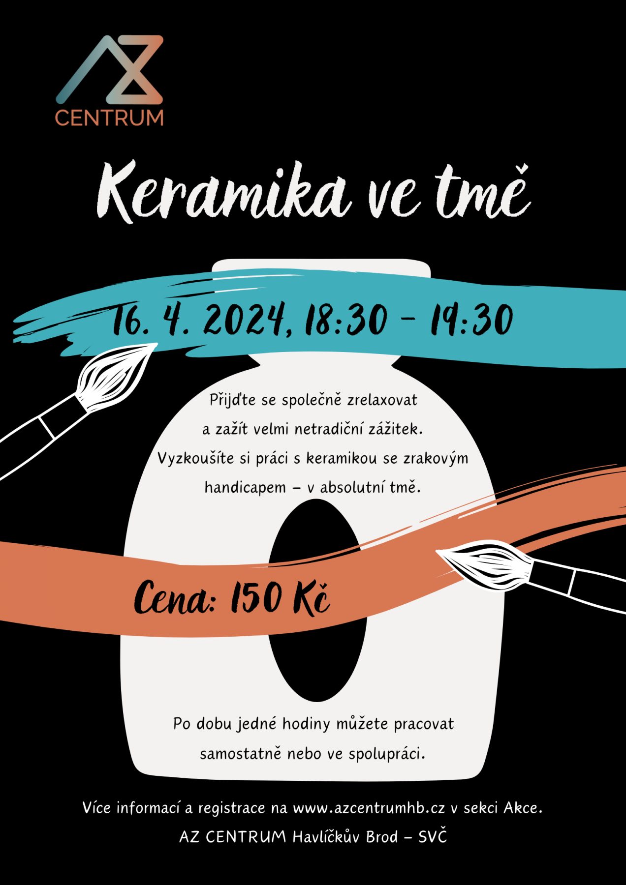Přijďte se společně zrelaxovat a zažít velmi netradiční zážitek. Po dobu jedné hodiny budeme pracovat s keramikou v absolutní tmě. Ať už jednotlivě nebo ve spolupráci si můžete vyzkoušet, jaké to je tvořit se zrakovým handicapem a používat jiné smysly, které nevidomému člověku nahrazují zrak.