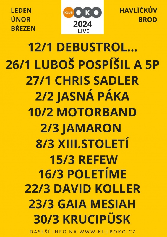 více info na www.kluboko.cz, FB a Instagram kluboko, vstupenky na smsticket.cz, nebo na www.kluboko.cz