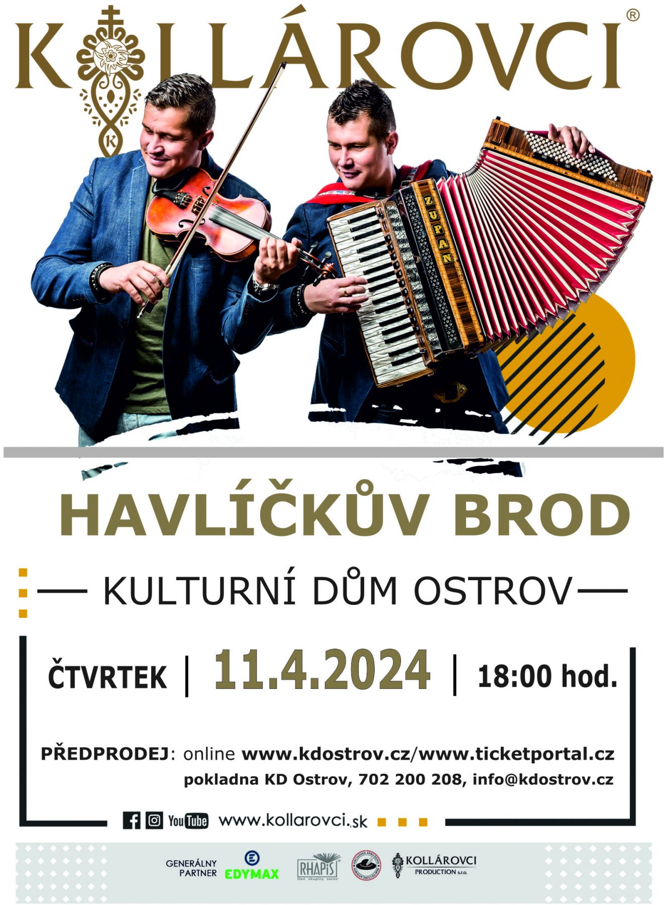 KOLLÁROVCI - CZ TOUR Srdečně Vás zveme na jedinečné koncerty oblíbené slovenské kapely Kollárovci! Hudebně zábavná show, v níž vynikající zpěvy a nádherná muzika nenechají nikoho sedět na židli. Přijďte i vy zažít fantastickou atmosféru s kapelou Kollárovci! <https://kollarovci.sk/> Kollárovci PhD. Tomáš Kollár housle, zpěv PaedDr. Štefan Kollár akordeon, saxofon, zpěv Mgr. Marek Kollár housle, zpěv Juraj Švedlár kontrabas, zpěv Július - Michal Hudi cimbál Dis. Art. Patrik Červenák bicí nástroje