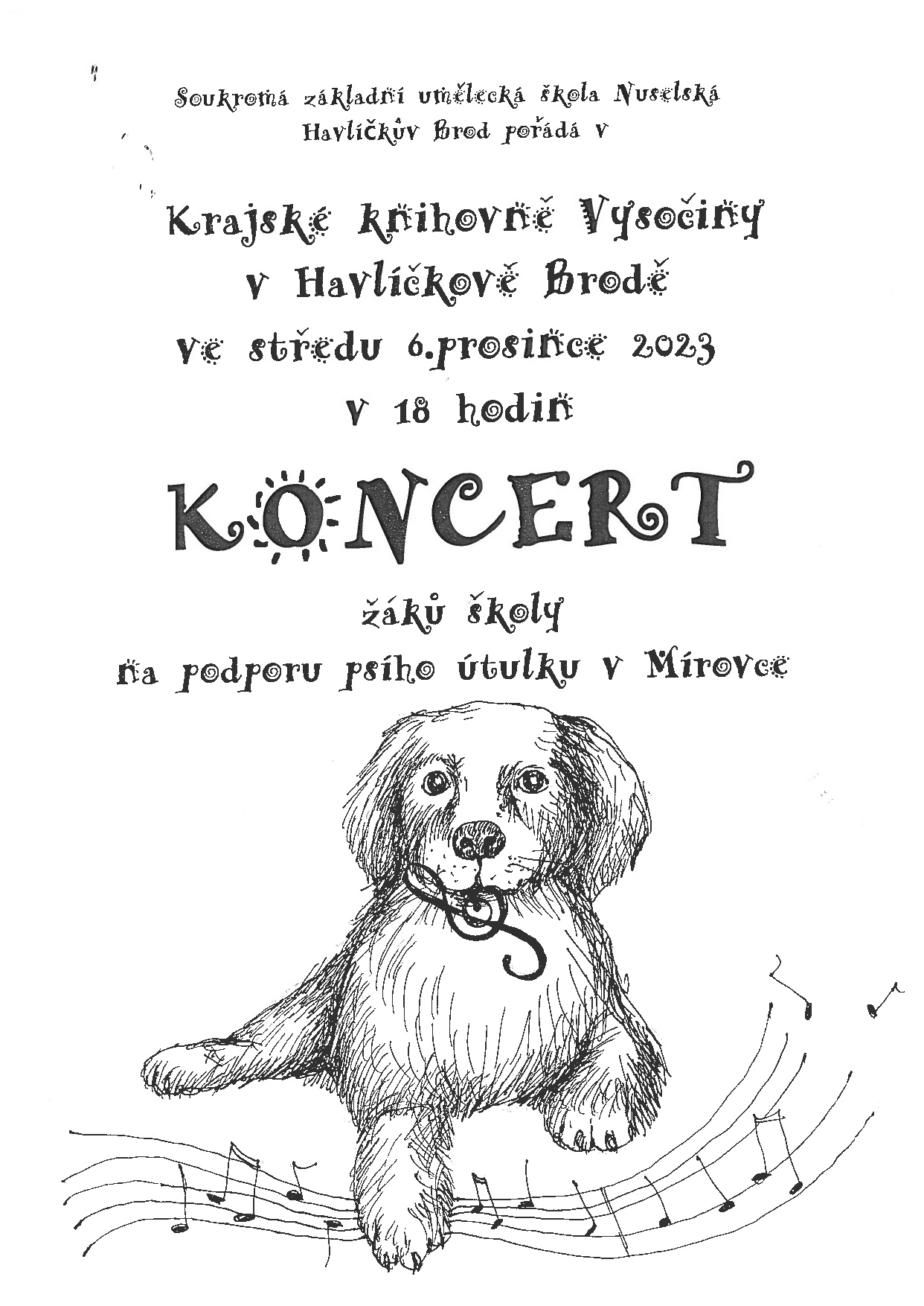 Soukromá základní umělecká škola Nuselská Havlíčkův Brod pořádá v Krajské knihovně Vysočiny KONCERT ŽÁKŮ ŠKOLY na podporu PSÍHO ÚTULKU V MÍROVCE.