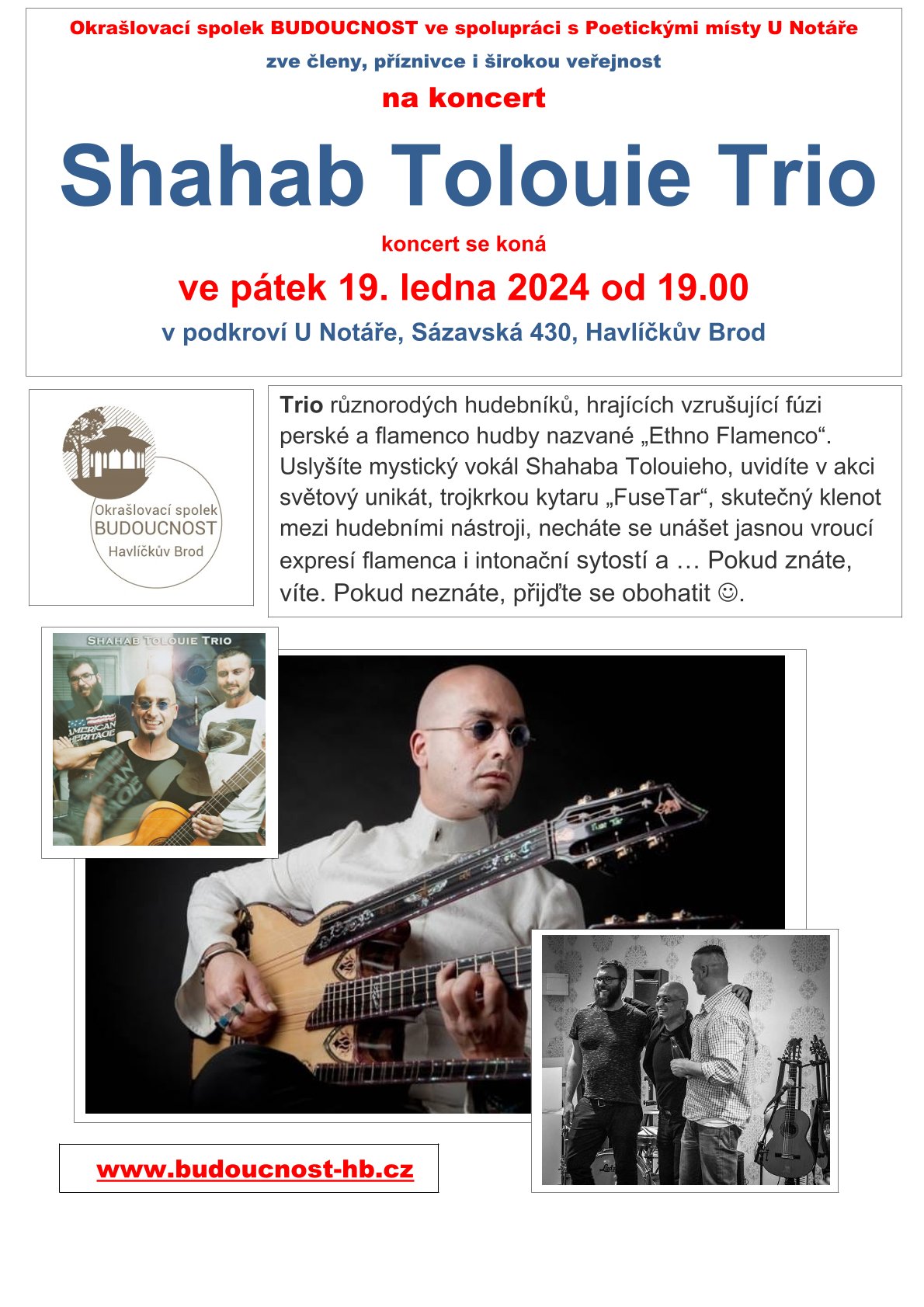 Trio různorodých hudebníků, hrajících vzrušující fúzi perské a flamenco hudby nazvané „Ethno Flamenco“. Uslyšíte mystický vokál Shahaba Tolouieho, uvidíte v akci světový unikát, trojkrkou kytaru „FuseTar“, skutečný klenot mezi hudebními nástroji, necháte se unášet jasnou vroucí expresí flamenca i intonační sytostí a … Pokud znáte, víte. Pokud neznáte, přijďte se obohatit :-).