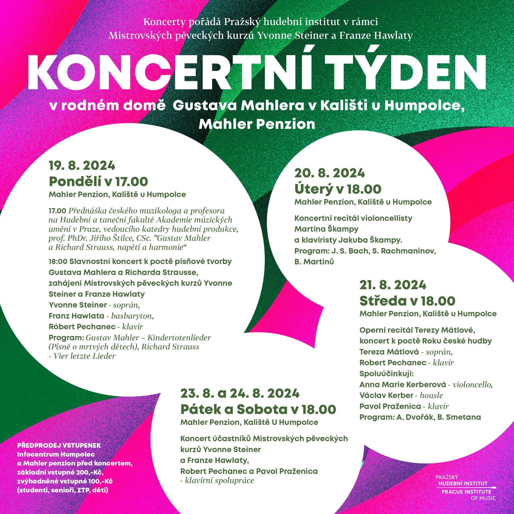 Koncerty pořádá Pražský hudební institut v rámci Mistrovských pěveckých kurzů Yvonne Steiner a Franze Hawlaty KONCERTNÍ TÝDEN v rodném domě Gustava Mahlera v Kališti u Humpolce, Mahler Penzion