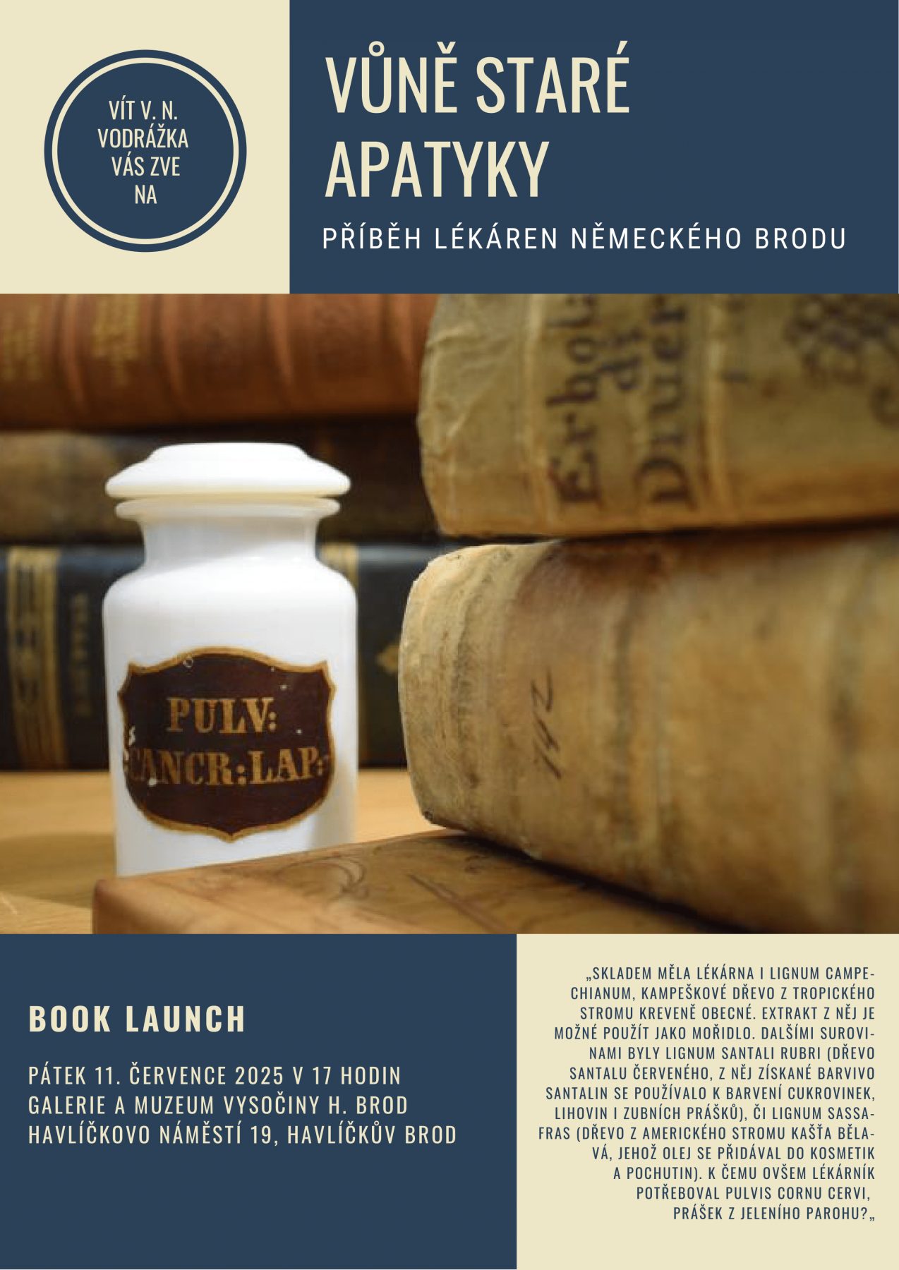 Rádi bychom vás pozvali na křest knihy Víta Vodrážky Vůně staré apatyky s podtitulem Příběh lékáren Německého Brodu. Slavnostní křest se uskuteční 11. července od 17:00 v muzeu.