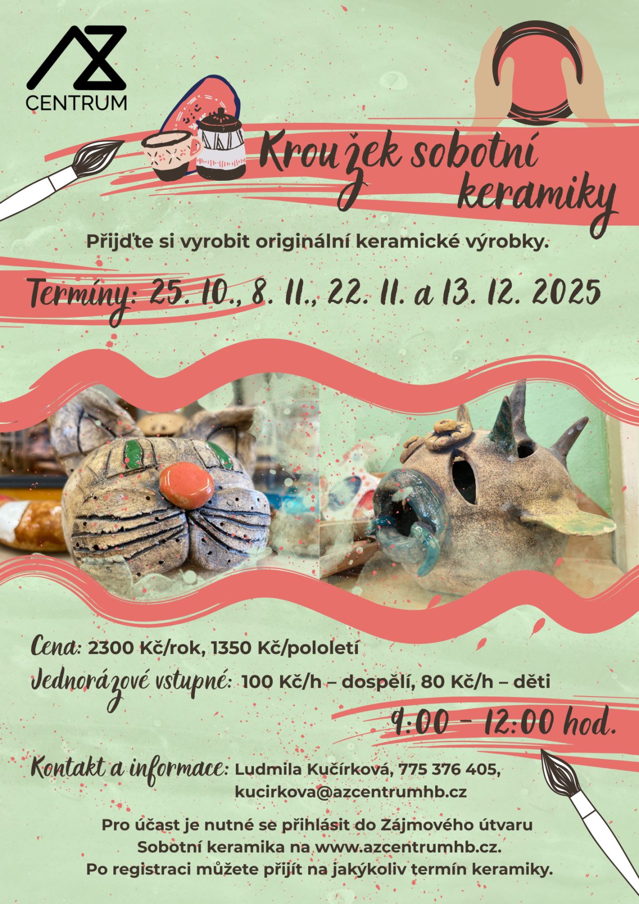 Sobotní keramika v AZ CENTRU pokračuje jako kroužek. Registrujte se na www.azcentrumhb.cz v sekci Zájmové útvary - přijít můžete jakýkoliv termín. Další termíny jsou 8. 11., 22. 11. a 13. 12. 2025. Cena jednorázově: 100 Kč/h – dospělí, 80 Kč/h – děti; nebo pololetí/rok: 1350 Kč/2300 Kč. Pojďte tvořit s námi.