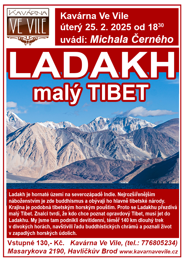 Ladakh je hornaté území na severozápadě Indie. Nejrozšířenějším náboženstvím je zde buddhismus a obývají ho hlavně tibetské národy. Krajina je podobná tibetským horským pouštím. Proto se Ladakhu přezdívá malý Tibet. Znalci tvrdí, že kdo chce poznat opravdový Tibet, musí jet do Ladakhu. My jsme tam podnikli devítidenní, téměř 140 km dlouhý trek v divokých horách, navštívili řadu buddhistických chrámů a poznali život v zapadlých horských údolích.