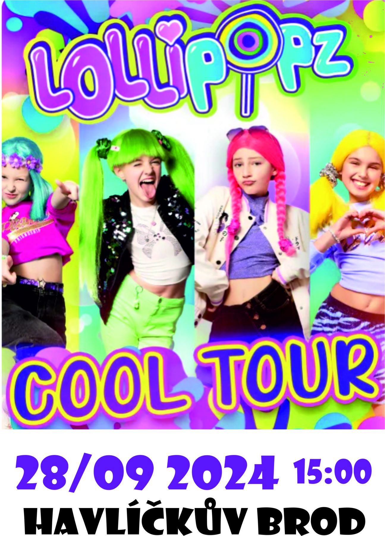 Nejpopulárnější česká hudební skupina pro děti vyráží na svou jedenáctou šňůru po Česku se svým Lollipopz COOL TOUR. Název novému turné dali samotní fanoušci, kterým Lollipopz při tvorbě nového programu, jako vždy, hodně naslouchali. Proto se můžete těšit na více písniček, mezi kterými kromě řady nových nebudou chybět oblíbené hity, ale i starší písničky, které si fanoušci vysloveně vyžádali. Někteří fanoušci budou mít možnost podívat se na pódium v rámci soutěží a her, které jsou součástí show a na vybrané šťastlivce čeká i možnost podívat se do backstage! Jako vždy je pro vás připravená barevná a bláznivá show, plná legrace, písniček a tancování, tak určitě přijeďte!