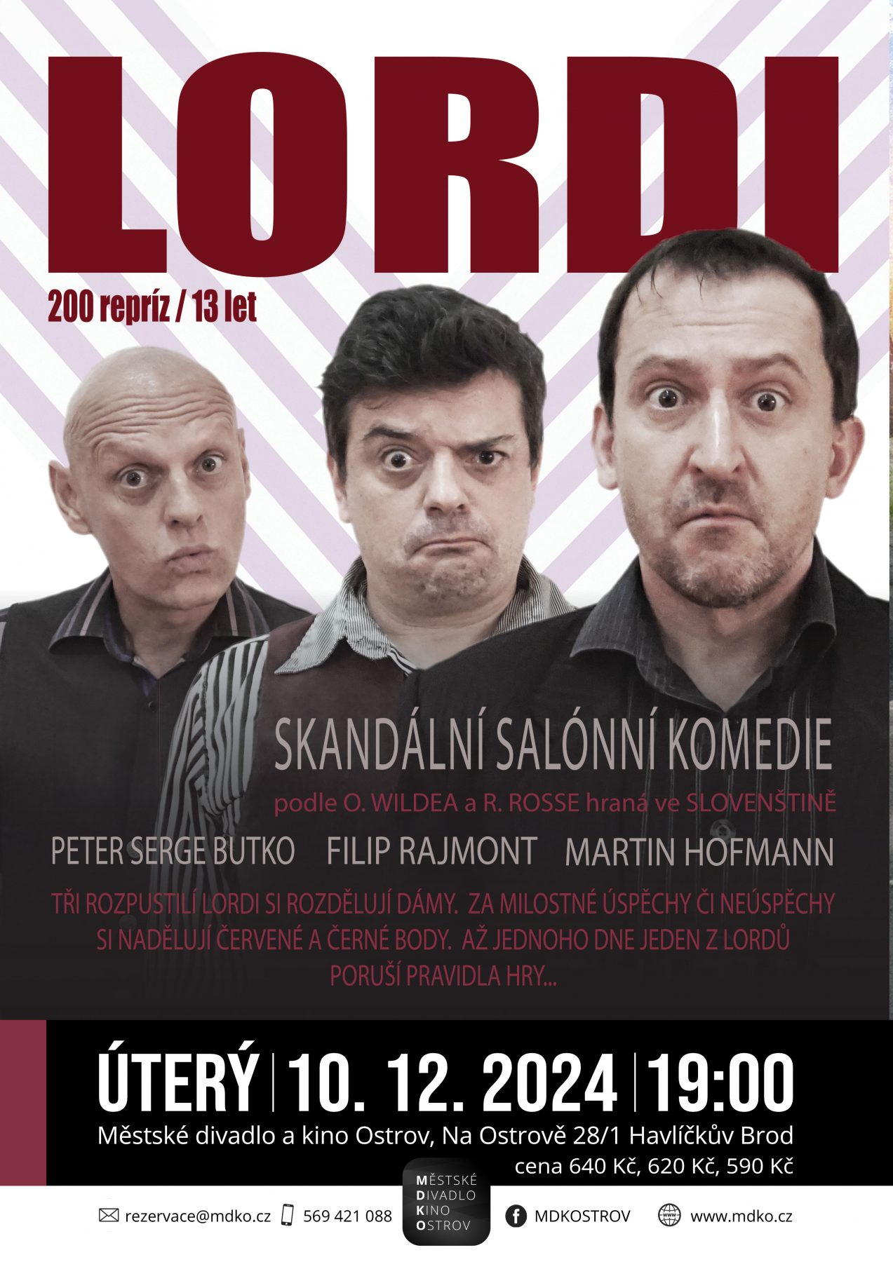 Rozverná komedie o třech rozpustilých slovenských lordech, kteří si v londýnském pánském klubu vyprávějí o svých milostných úspěších. Zážitky jsou to košilaté, ale ten největší na lordy teprve čeká a diváci si jej vyslechnou tak říkajíc z první ruky.. Kdo tuto komedii již viděl, tak ji určitě bude chtít vidět zase, a kdo ji ještě neviděl, neměl by si ji nechat ujít. Bavit se bude celý sál. Dámy, vezměte do divadla i své protějšky! Hra je vhodná i pro muže, kteří před návštěvou divadla dávají přednost vůni kouře doutníků a chuti skvěle vychlazeného bourbonu...Naopak školní dítka do 15 let a puritánsky založené ženy nechte raději doma.