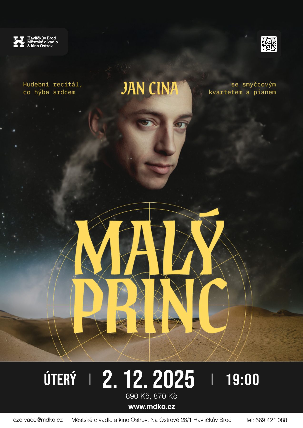 Naše ztvárnění není klasickým vyprávěním příběhu Malého prince. Je to originální spojení hudby a slova, které divákovi umožní oddat se své fantazii a pohladí ho na duši. V recitálu exceluje známý herec Jan Cina, který nás provede kouzelným světem, kde vše, co je důležité, je očím neviditelné. Spolu se zpěvačkou Vendulou Příhodovou představí původní písně od Kryštofa Marka, doprovázené pianem a smyčcovým kvartetem Unique Quartet. Představení je vhodné pro diváky všech věkových kategorií.