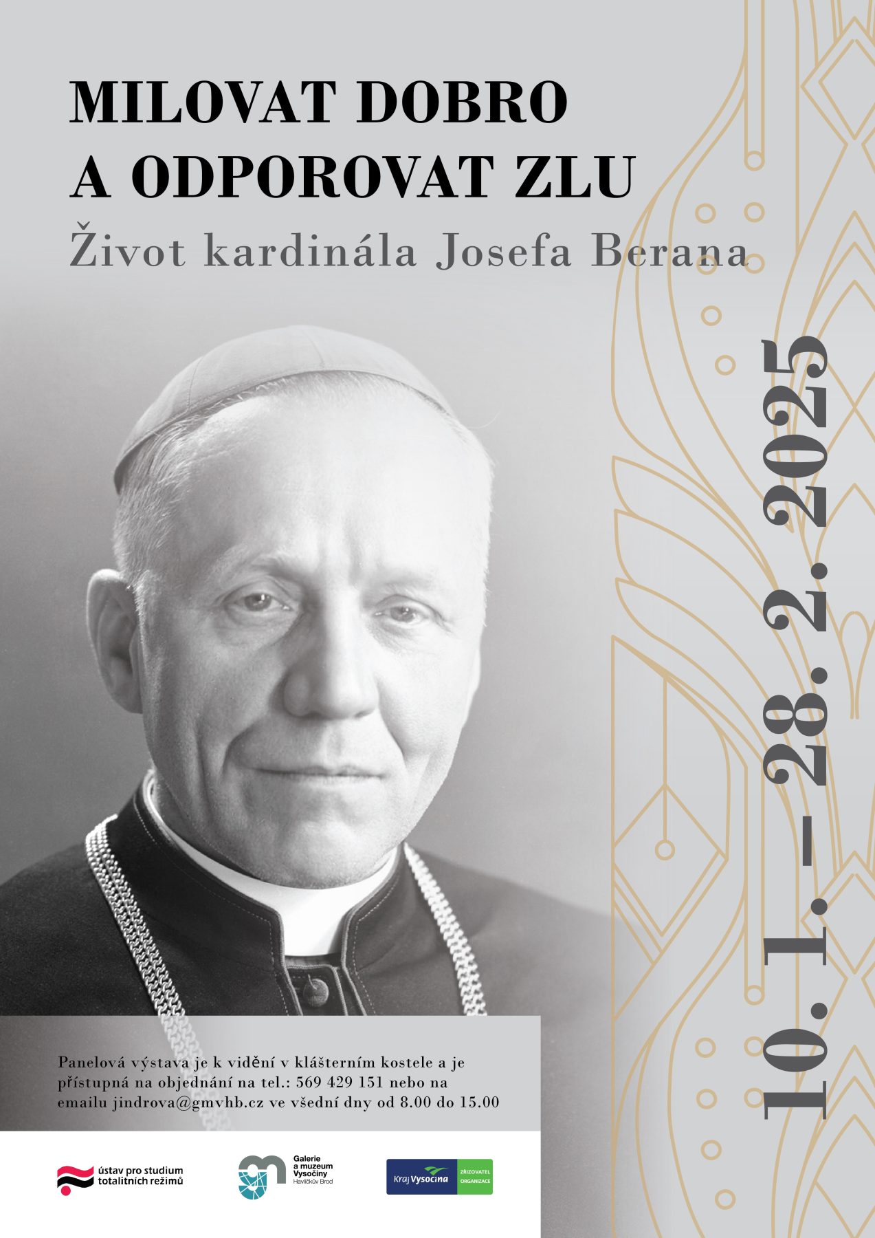 Srdečně Vás zveme na výstavu „Milovat dobro a odporovat zlu“, která na deseti panelech přibližuje životní mezníky kardinála Berana, zasazuje je do historických souvislostí a podtrhuje význam jeho osobnosti v odporu vůči totalitním režimům 20. století – nacismu a komunismu. Výstava je k vidění v klášterním kostele v Havlíčkově Brodě od 10. 1. do 28. 2. 2025. Výstavu je možné shlédnout každý všední den od 8.00 do 15.00 (po domluvě případně i v jiné termíny) na objednání na tel.: 569 429 151 nebo na emailu jindrova%z%gmvhb.cz. Školy mohou využít na objednání komentovanou prohlídku spojenou s připomenutím dalších významných osobností z prostředí katolické církve z našeho regionu.