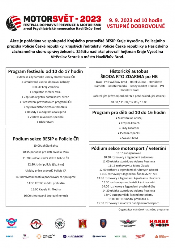 Už tento je tu MotorSvět 2023 – Festival dopravní prevence a motorismu v Havlíčkově Brodě. Brány areálu Psychiatrické nemocnice Havlíčkův Brod se veřejnosti otevřou v 10 hodin a III. ročník nabídne opět skvělý program. Akci pořádá Veronika Vošická Buráňová (Krajský koordinátor BESIPu) a Radek Pavlíček. Nově se v letošním roce do organizace vložila i Policie ČR a Hasičský záchranný sbor správy železnic. Těšit se můžete na preventivní programy a partnerské subjekty BESIPu. Změříme Vám řidičské reakce, ale i zrak. Nakoupit můžete reflexní prvky, nebo třeba i nové auto. Program je připraven pro celou rodinu. V letošním roce poprvé i kulturní hudební program a dvě sekce – dětské divadlo, koncert Hudby Hradní stráže Policie ČR a kapela III. Třetina. Závěrem akce se představí Hasičský záchranný sbor správy železnic u ukázky technického zásahu u dopravní nehody. Naopak v druhé části areálu si přijdou na své všichni milovníci motorismu – závodní speciály, rozhovory, historická vozidla, klubové srazy, ukázka stuntridera Adama Peschela. Dynamické ukázky nadějí autokrosu i rozhovory s legendami. Povozíte na koních i v kočáře, děti si odnesou obrázek na obličeji i zapletené vlasy. Samozřejmostí bude i svozový autobus Škoda RTO. Událostí Vás provede živé vysílání přímo z Českého rozhlasu Vysočina.