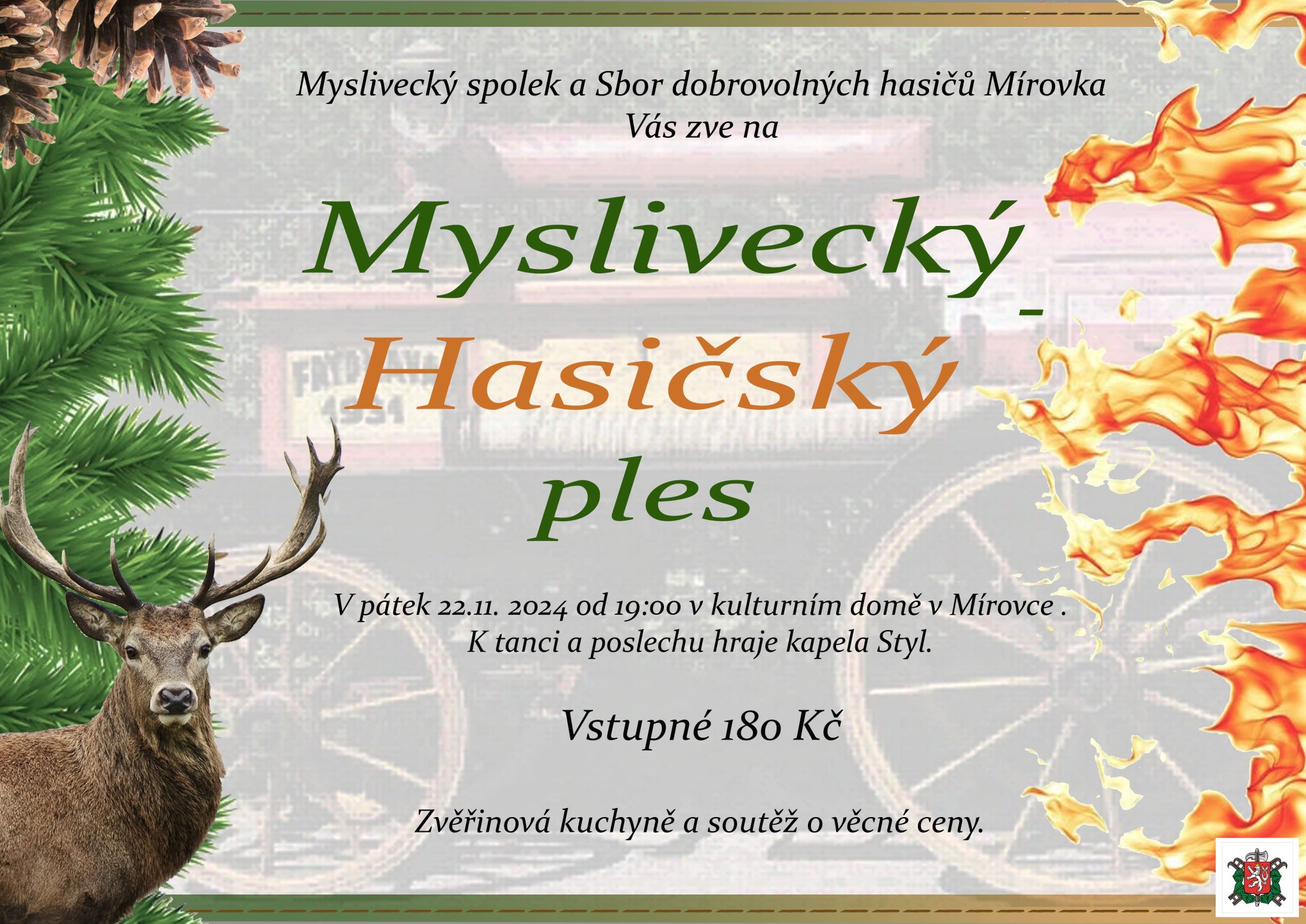 Myslivecký spolek a sbor dobrovolných hasičů Mírovka Vás zve na ples plný zábavy