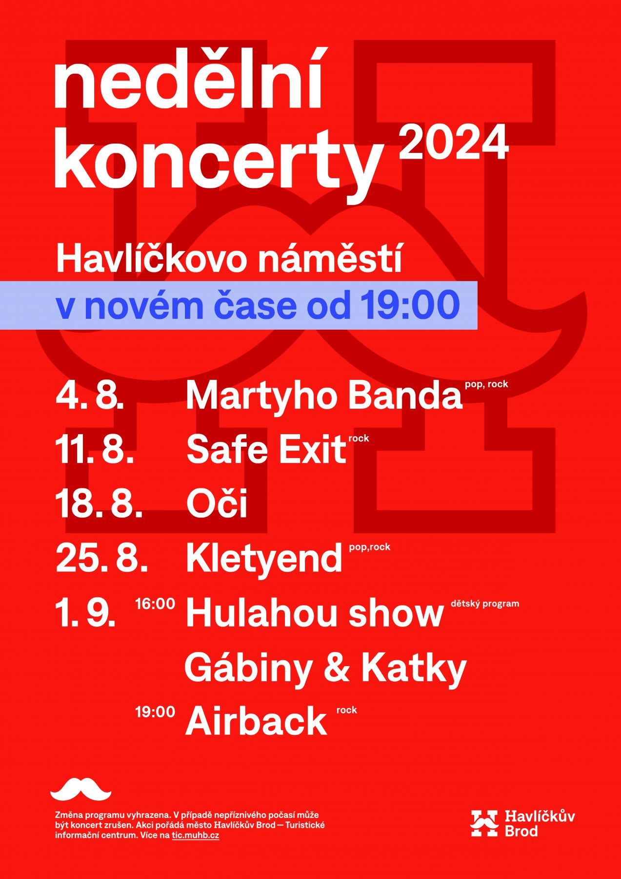 Přijďte si užít nedělní večery plné hudby na Havlíčkově náměstí! Každou neděli od 18:00 (v srpnu od 19:00 h) vás čekají skvělá vystoupení a nezapomenutelná atmosféra.