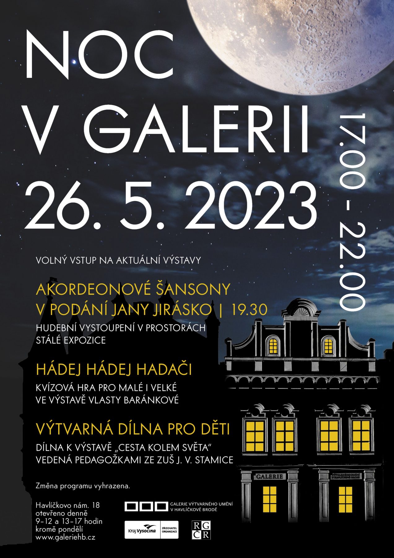Galerie výtvarného umění v Halíčkově Brodě pořádá i v letošním roce Noc v galerii. Těšit se můžete na výtvarné dílny, hudební vystoupení i soutěžní kvíz. Otevřeno bude 17:00 - 22:00, vstupné zdarma.