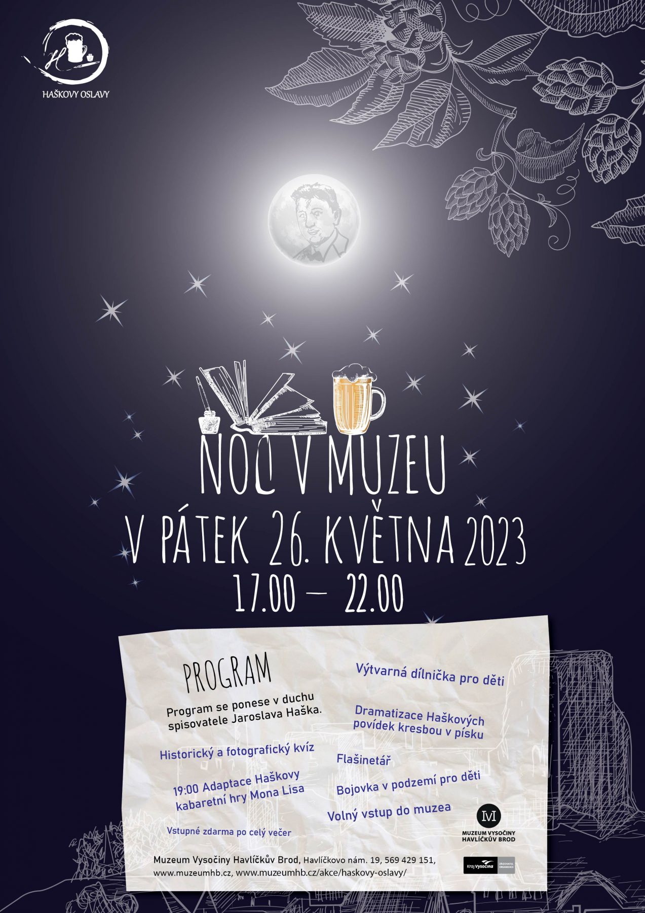 Muzeum Vysočiny Havlíčkův Brod vás srdečně zve na tradiční akci, kterou si nemůžete nechat ujít! Po roce nás čeká opět Muzejní noc, která se letos ponese v duchu Jaroslava Haška. V pátek 26. května od 17:00 do 22:00 si mohou návštěvníci užít volný vstup do expozice a současně probíhající výstavy o Jaroslavu Haškovi – Člověk míní, hospoda mění. Dále bude připravený program jak pro malé, tak i velké. Těšit se můžete na skvělého flašinetáře, divadlo formou kresby v písku, dílničky pro děti, historický a fotografický kvíz. Na programu bude rovněž kratičká adaptace Haškovy hry Mona Lisa a v podzemí bude na děti čekat bojovka s názvem Za tajemstvím strašidla.